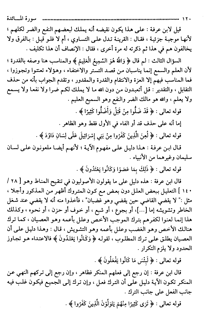 قال ابن عرفة: إن رجع إلى فعلهم المنكر فظاهر، وإن رجع إلى تركهم النهي عن المنكر تكون الآية دليل على أن الترك فعل، وإن ترك إلى الجميع فيكون غلب فيه جانب الفعل على جانب الترك.