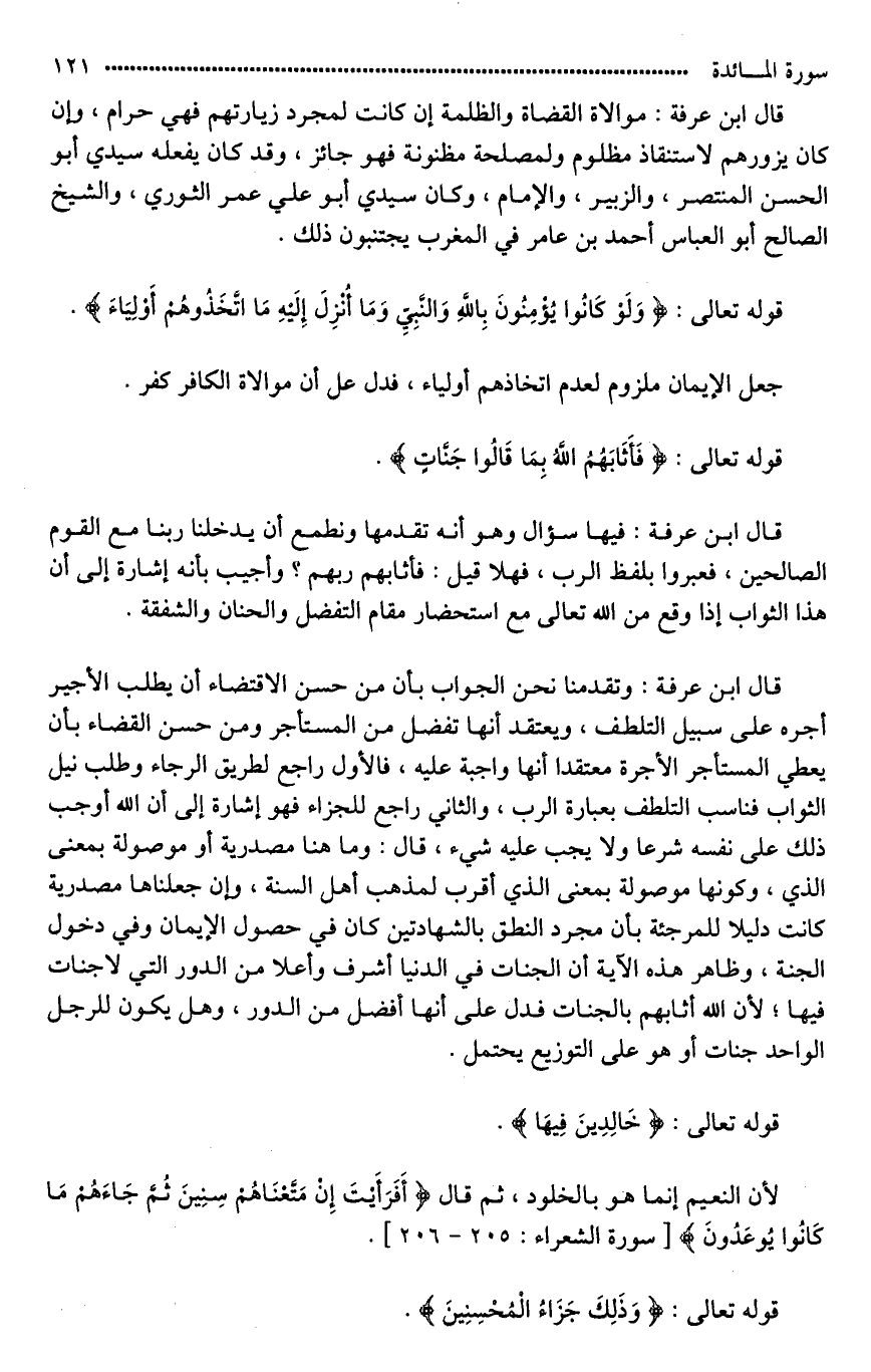 قال ابن عرفة: وتقدمنا نحن الجواب بأن من حسن الاقتضاء أن يطلب الأجير أجره على سبيل التلطف، ويعتقد أنها تفضل من المستأجر ومن حسن القضاء بأن يعطي المستأجر الأجرة معتقدا أنها واجبة عليه، فالأول راجع لطريق الرجاء وطلب نيل الثواب فناسب التلطف بعبارة الرب، والثاني راجع للجزاء فهو إشارة إلى أن الله أوجب ذلك على نفسه شرعا ولا يجب عليه شيء، قال: وما هنا مصدرية أو موصولة بمعنى الذي، وكونها موصولة بمعنى الذي أقرب لمذهب أهل السنة، وإن جعلناها مصدرية كانت دليلا للمرجئة بأن مجرد النطق بالشهادتين كان في حصول الإيمان وفي دخول الجنة، وظاهر هذه الآية أن الجنات في الدنيا أشرف وأعلى من الدور التي لا جنات فيها؛ لأن الله أثابهم بالجنات فدل على أنها أفضل من الدور، وهل يكون للرجل الواحد جنات أو هو على التوزيع يحتمل.
