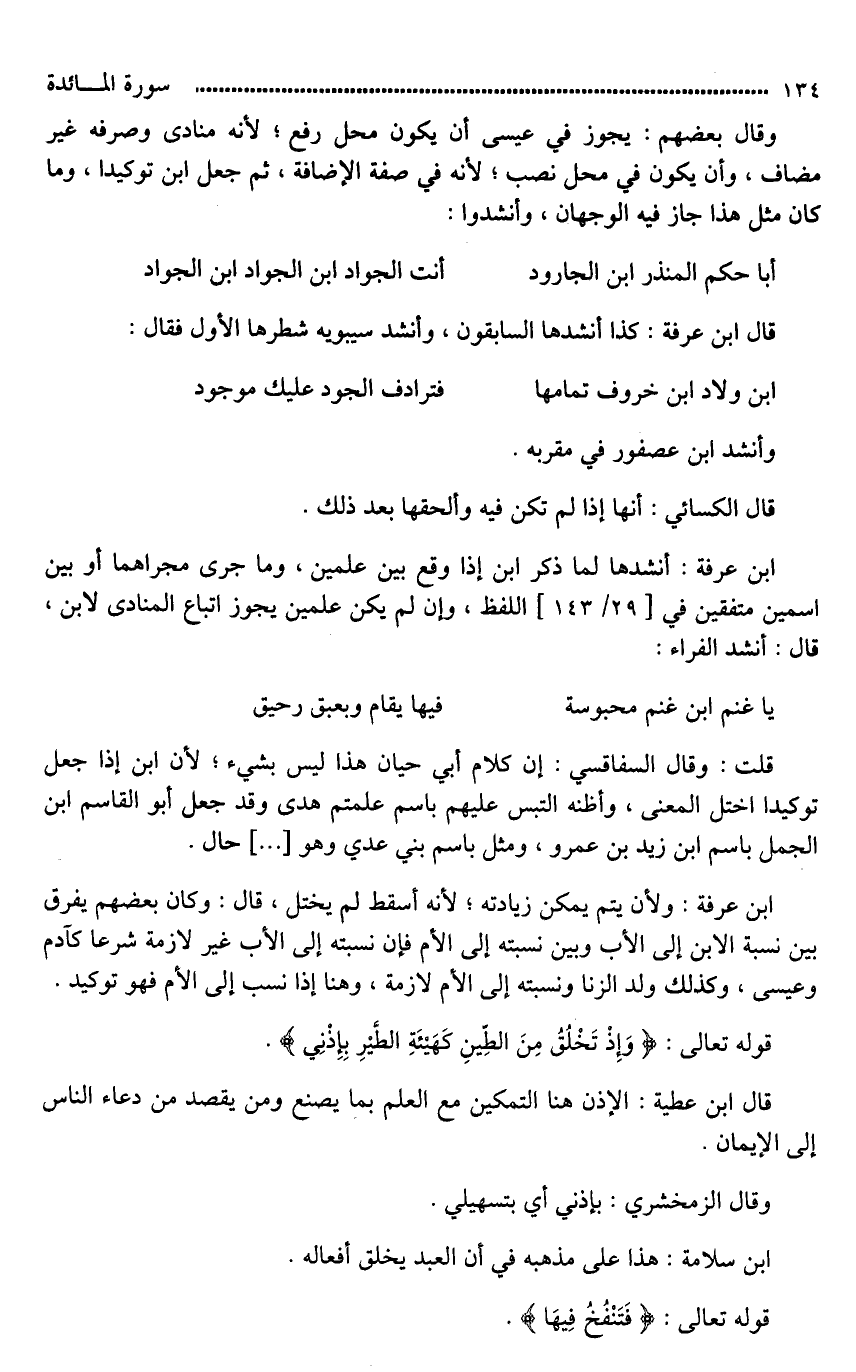 ابن عرفة: أنشدها لما ذكر ابن إذا وقع بين علمين، وما جرى مجراهما أو بين اسمين متفقين في اللفظ، وإن لم يكن علمين يجوز اتباع المنادى لابن، قال: أنشد الفراء: