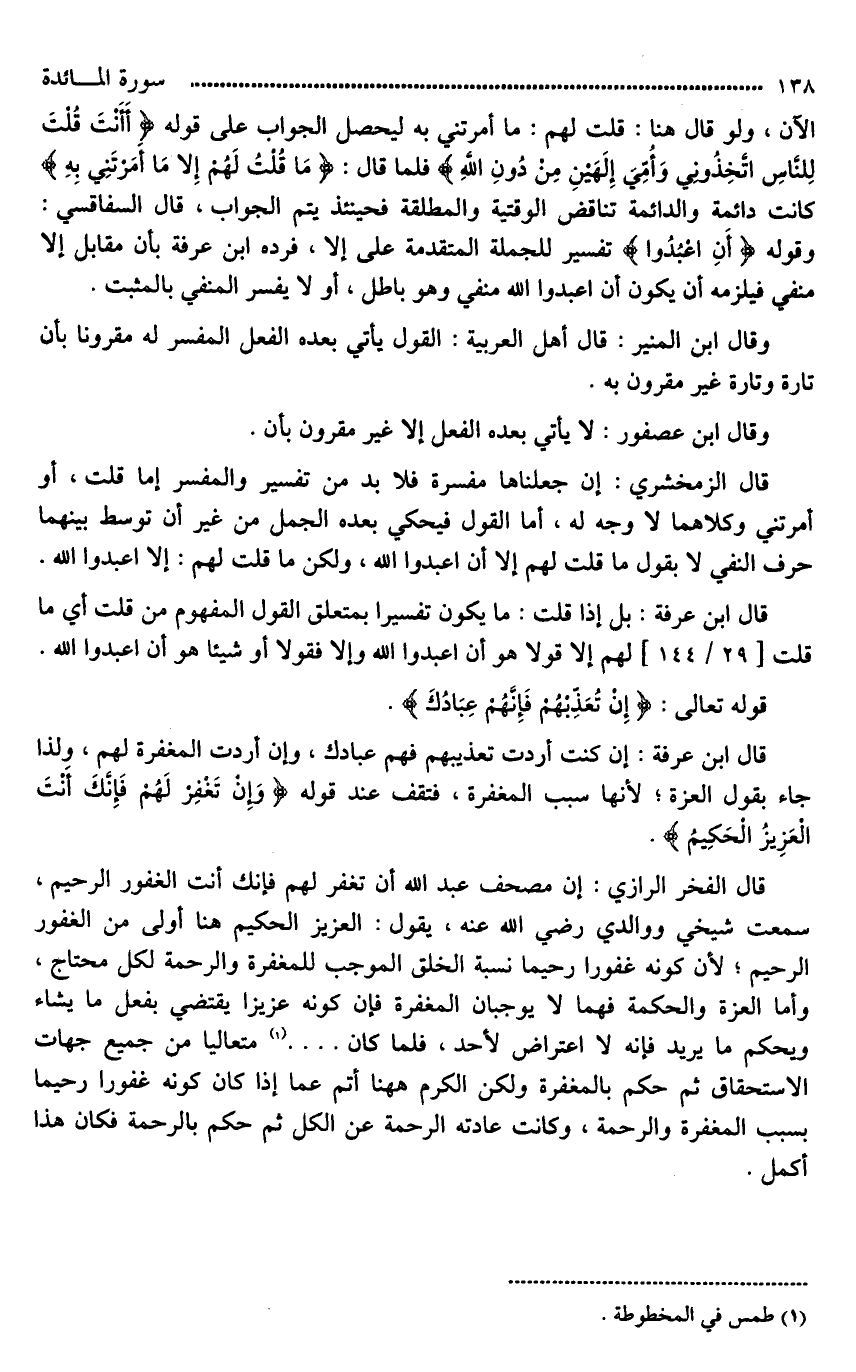 قال الفخر الرازي: إن مصحف عبد الله إن تغفر لهم فإنك أنت الغفور الرحيم، سمعت شيخي ووالدي رضي الله عنه، يقول: العزيز الحكيم هنا أولى من الغفور الرحيم؛ لأن كونه غفورا رحيما نسبة الخلق الموجب للمغفرة والرحمة لكل محتاج، وأما العزة والحكمة فهما لَا يوجبان المغفرة فإن كونه عزيزا يقتضي بفعل ما يشاء ويحكم ما يريد فإنه لَا اعتراض لأحد، [فَإِذَا كَانَ عَزِيزًا *] متعاليا من جميع جهات الاستحقاق ثم حكم بالمغفرة [كان*] الكرم هاهنا أتم عما إذا كان كونه غفورا رحيما بسبب المغفرة والرحمة، [فَكَانَتْ عِبَارَتُهُ رَحِمَهُ اللَّه أَنْ يَقُولَ: عَزَّ عَنِ الْكُلِّ. ثُمَّ حَكَمَ بِالرَّحْمَةِ فَكَانَ هَذَا أَكْمَلَ *].
