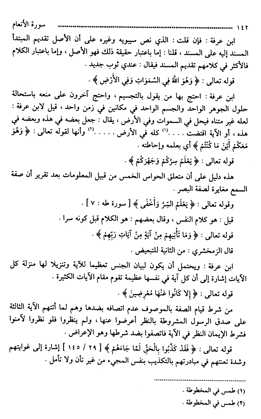 ابن عرفة: احتج بها من يقول بالتجسيم، واحتج آخرون على منعه باستحالة حلول الجوهر الواحد والجسم الواحد في مكانين في زمن واحد، قيل لابن عرفة: لعله غير متناه فيحل في السماوات، وفي الأرض، يقال: جعل بعضه في هذه وبعضه في هذه، أو الآية اقتضت [ ... ] كله في الأرض [ ... ] وأنها لقوله تعالى: (وَهُوَ مَعَكُمْ أَيْنَ مَا كُنْتُمْ) أي بعلمه وإحاطته.