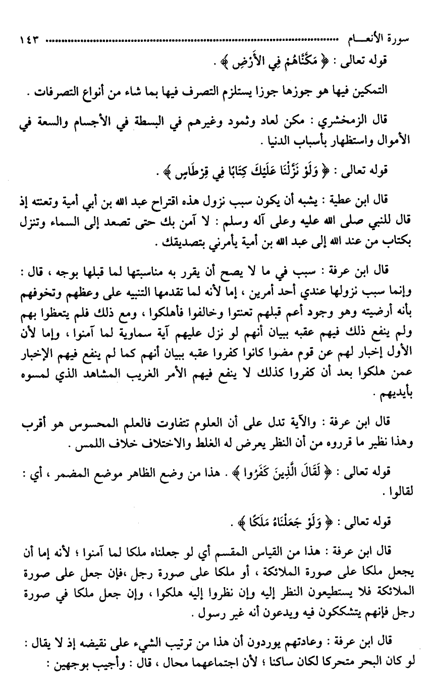 قال ابن عرفة: وعادتهم يوردون أن هذا من ترتيب الشيء على نقيضه إذ لَا يقال: لو كان البحر متحركا لكان ساكنا؛ لأن اجتماعهما محال، قال: وأجيب بوجهين: