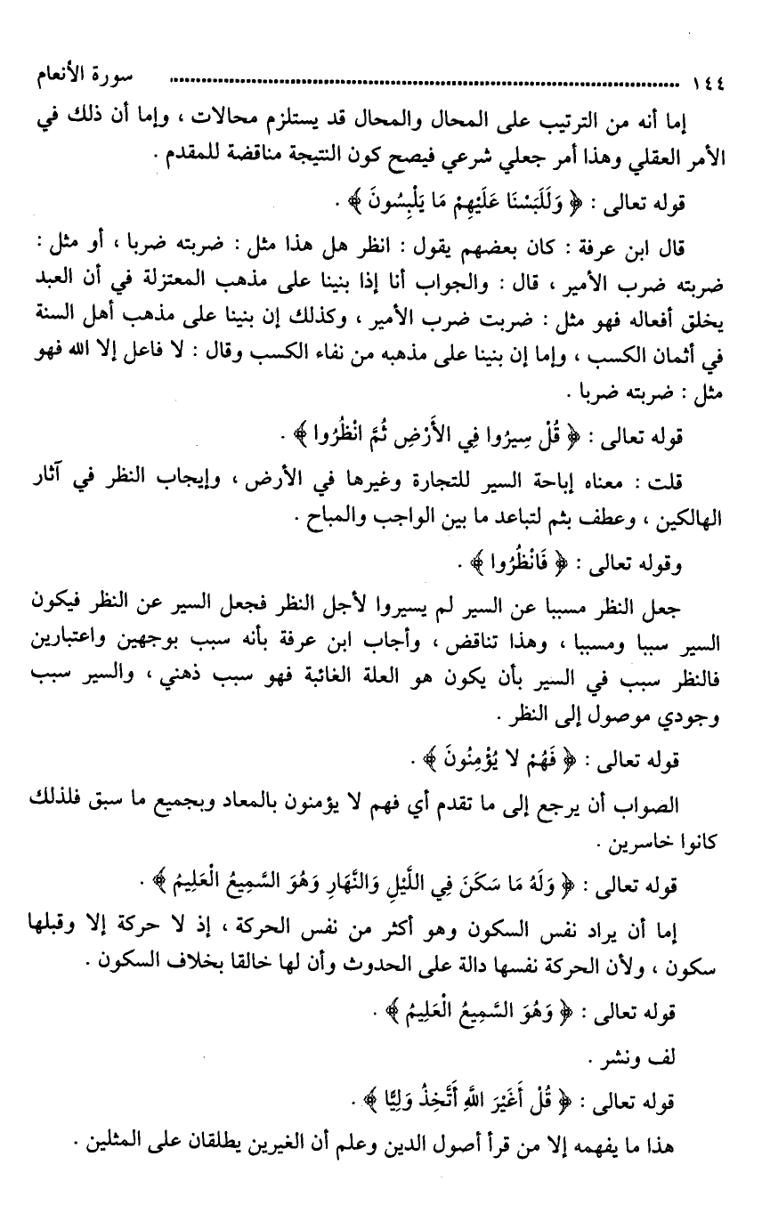 جعل النظر مسببا عن السير لم يسيروا لأجل النظر فجعل السير عن النظر فيكون السير سببا ومسببا، وهذا تناقض، وأجاب ابن عرفة بأنه سبب بوجهين واعتبارين فالنظر سبب في السير بأن يكون هو [العلة الغائية*] فهو سبب ذهني، والسير سبب وجودي موصول إلى النظر.