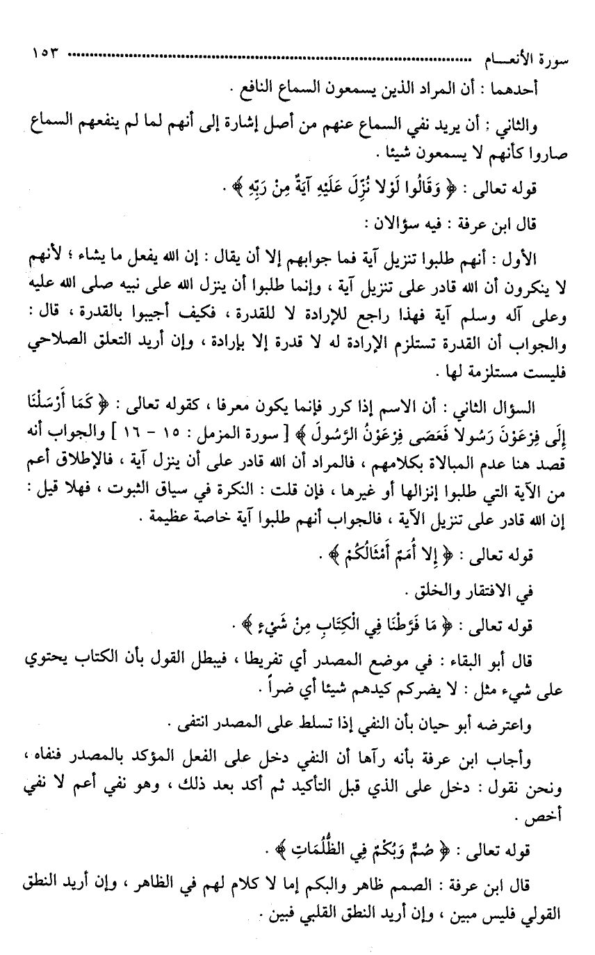 وأجاب ابن عرفة بأنه رآها أن النفي دخل على الفعل المؤكد بالمصدر فنفاه، ونحن نقول: دخل على الذي قبل التأكيد ثم أكد بعد ذلك، وهو نفي أعم لَا نفي أخص.
