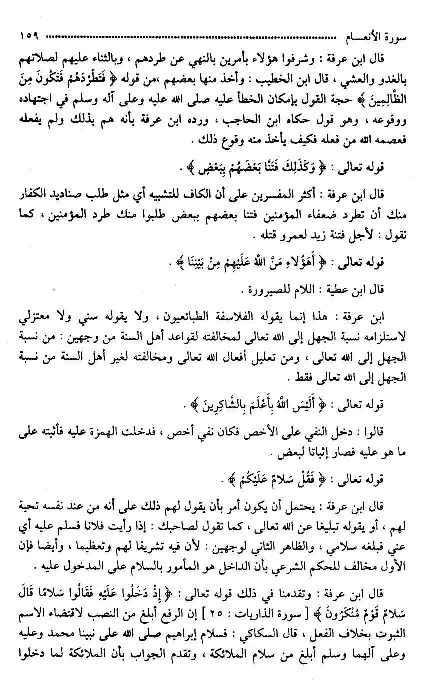 قال ابن عرفة: وشرفوا هؤلاء بأمرين بالنهي عن طردهم، وبالثناء عليهم لصلاتهم بالغدو والعشي، قال ابن الخطيب: وأخذ منها بعضهم كلمن قوله (فَتَطْرُدَهُمْ فَتَكُونَ مِنَ الظَّالِمِينَ) حجة القول بإمكان الخطأ عليه صلى الله عليه وعلى آله وسلم في اجتهاده ووقوعه، وهو قول حكاه ابن الحاجب، ورده ابن عرفة بأنه هم بذلك ولم يفعله فعصمه الله من فعله فكيف يأخذ منه وقوع ذلك.