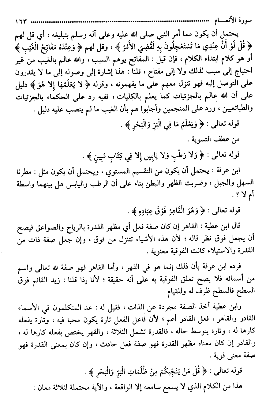 فرده ابن عرفة بأن ذلك إنما هو في القهر، وأما القاهر فهو صفة لله تعالى واسم من أسمائه فلا يصح تعلق الفوقية به على أنه حقيقة؛ لأنا إذا قلنا: زيد القائم فوق السطح فالسطح ظرف له وللقيام.