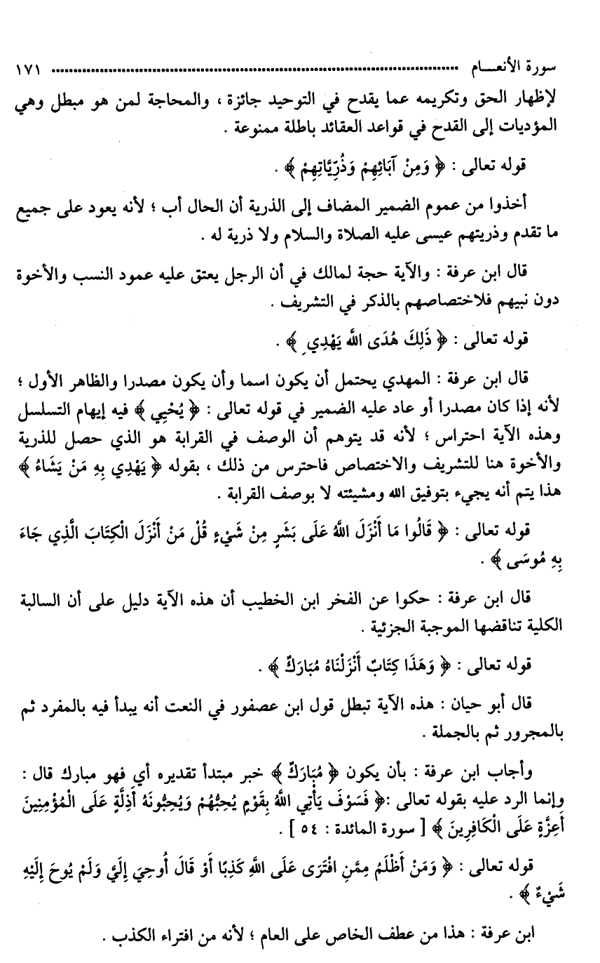 قال ابن عرفة: المهدي يحتمل أن يكون اسما، وأن يكون مصدرا، والظاهر الأول؛ لأنه إذا كان مصدرا، [وعاد*] عليه الضمير في قوله تعالى: [(يَهْدِي) *] [ففيه*] إيهام التسلسل وهذه الآية احتراس؛ لأنه قد يتوهم أن الوصف في القرابة هو الذي حصل للذرية، والأخوة هنا للتشريف والاختصاص فاحترس من ذلك، بقوله (يَهْدِي بِهِ مَن يَشَاءُ) هذا يتم أنه يجيء بتوفيق الله ومشيئته لَا بوصف القرابة.
