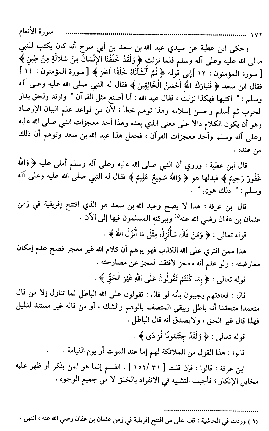 وحكى ابن عطية عن سيدي عبد الله بن سعد بن أبي سرح أنه كان يكتب للنبي صلى الله عليه وعلى آله وسلم فلما نزلت (وَلَقَدْ خَلَقْنَا الإنْسَان مِنْ سُلالَةٍ مِن طِينٍ) إلى قوله (ثُمَّ أَنشَأنَاهُ خَلْقًا آخَرَ). فقال ابن سعد (فَتَبَارَكَ اللَّهُ أَحْسَنُ الْخَالِقِينَ) فقال له النبي صلى الله عليه وعلى آله وسلم: "اكتبها فهكذا نزلت، فقال عبد الله: أنا أصنع مثل القرآن" وارتد ولحق بدار الحرب ثم أسلم وحسن إسلامه وهذا توهم خطأ؛ لأن من قواعد علم البيان الإرصاد وهو أن يكون الكلام دالا على معنى الذي بعده وهذا أحد معجزات النبي صلى الله عليه وعلى آله وسلم وأحد معجزات القرآن، فجعل هذا عبد الله بن سعد وتوهم أن ذلك من عنده.