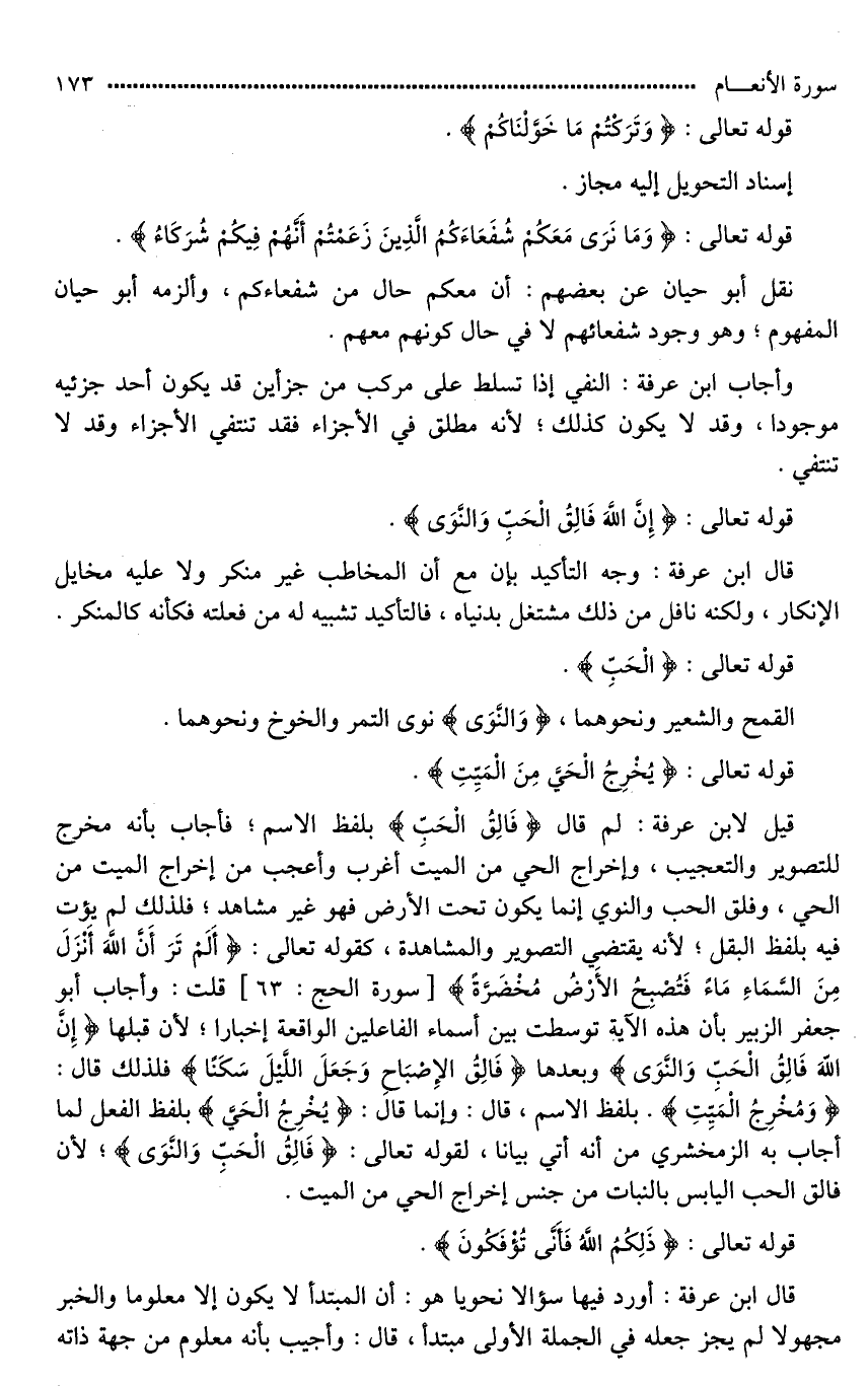 قيل لابن عرفة: لم قال (فَالِقُ الْحَبِّ) بلفظ الاسم؛ فأجاب بأنه مخرج للتصوير والتعجيب، وإخراج الحي من الميت أغرب وأعجب من إخراج الميت من الحي، وفلق الحب والنوي إنما يكون تحت الأرض فهو غير مشاهد. فلذلك لم يؤت فيه بلفظ البقل؛ لأنه يقتضي التصوير والمشاهدة، كقوله تعالى: (أَلَمْ تَرَ أَنَّ اللَّهَ أَنْزَلَ مِنَ السَّمَاءِ مَاءً فَتُصْبِحُ الْأَرْضُ مُخْضَرَّةً) قلت: وأجاب أبو جعفر الزبير بأن هذه الآية توسطت بين أسماء الفاعلين الواقعة إخبارا؛ لأن قبلها (إِنَّ اللَّهَ فَالِقُ الْحَبِّ وَالنَّوَى) وبعدها (فَالِقُ الْإِصْبَاحِ وَجَعَلَ اللَّيْلَ سَكَنًا) فلذلك قال: (وَمُخْرِجُ الْمَيِّتِ). بلفظ الاسم، قال: وإنَّمَا قال: (يُخْرِجُ الْحَيَّ) بلفظ الفعل لما أجاب به الزمخشري من أنه أتي بيانا، لقوله تعالى: (فَالِقُ الْحَبِّ وَالنَّوَى)؛ لأن فالق الحب اليابس بالنبات من جنس إخراج الحي من الميت.
