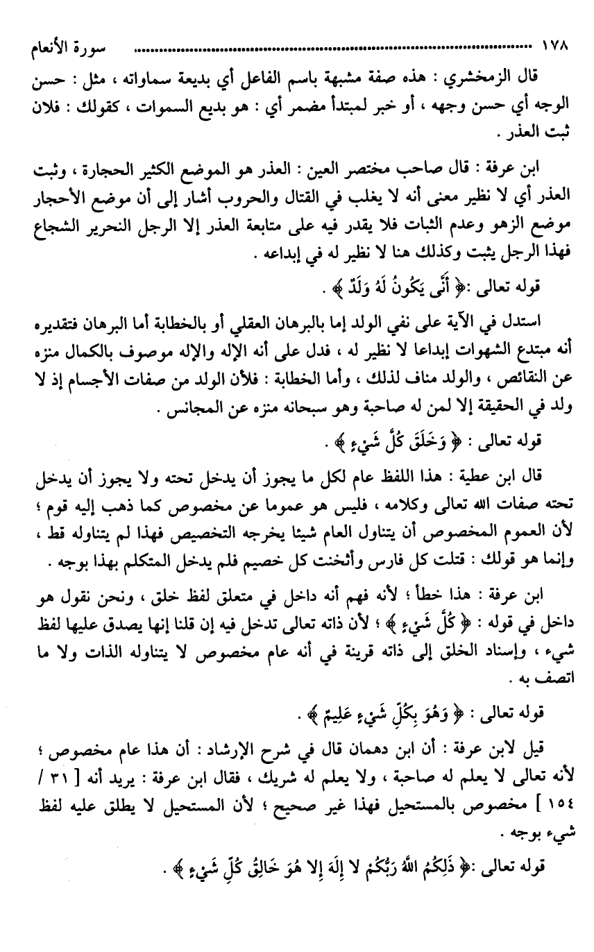 ابن عرفة: هذا خطا؛ لأنه فهم أنه داخل في متعلق لفظ خلق، ونحن نقول هو داخل في قوله: (كُلَّ شَيْءٍ)؛ لأن ذاته تعالى تدخل فيه إن قلنا إنها يصدق عليها لفظ شيء، وإسناد الخلق إلى ذاته قرينة في أنه عام مخصوص لَا يتناوله الذات ولا ما اتصف به.