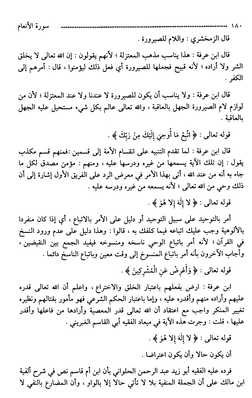 ابن عرفة: ارض بفعلهم باعتبار الخلق والاختراع، واعلم أن الله تعالى قدره عليهم وأراده منهم وأقدرهم عليه، وإما باعتبار الحكم الشرعي فهو مأمور بقتالهم ونظيره تغيير المنكر واجب مع اعتقاد أن الله تعالى قدر المعصية وأرادها من فاعلها وأقدر عليها، قلت: وجرت هذه الآية في ميعاد الفقيه أبي القاسم الغبريني.