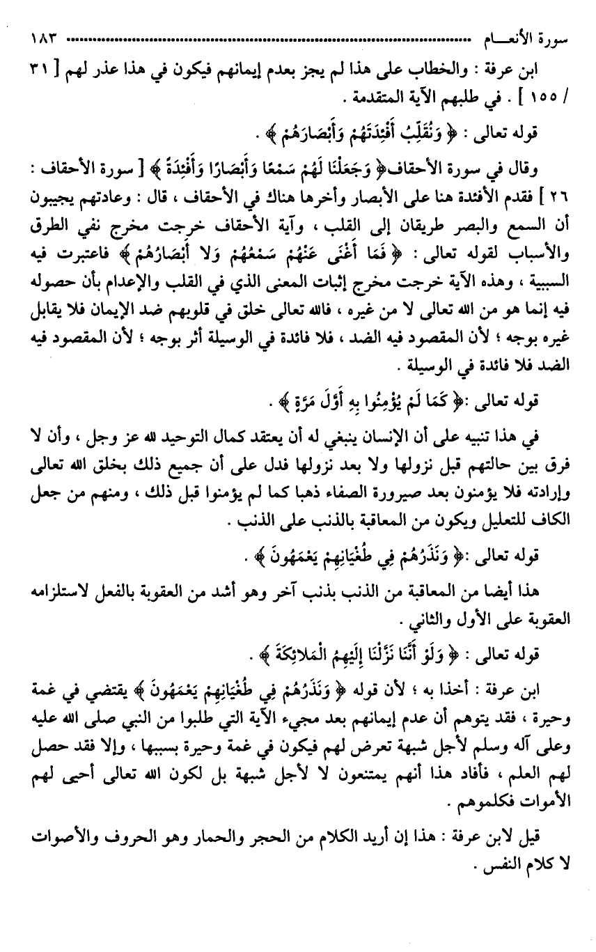 ابن عرفة: أخذا به؛ لأن قوله (وَنَذَرُهُمْ فِي طُغْيَانِهِمْ يَعْمَهُونَ) يقتضي في غمة وحيرة، فقد يتوهم أن عدم إيمانهم بعد مجيء الآية التي طلبوا من النبي صلى الله عليه وعلى آله وسلم لأجل شبهة تعرض لهم فيكون في غمة وحيرة بسببها، وإلا فقد حصل لهم العلم، فأفاد هذا أنهم يمتنعون لَا لأجل شبهة بل لكون الله تعالى أحيا لهم الأموات فكلموهم.