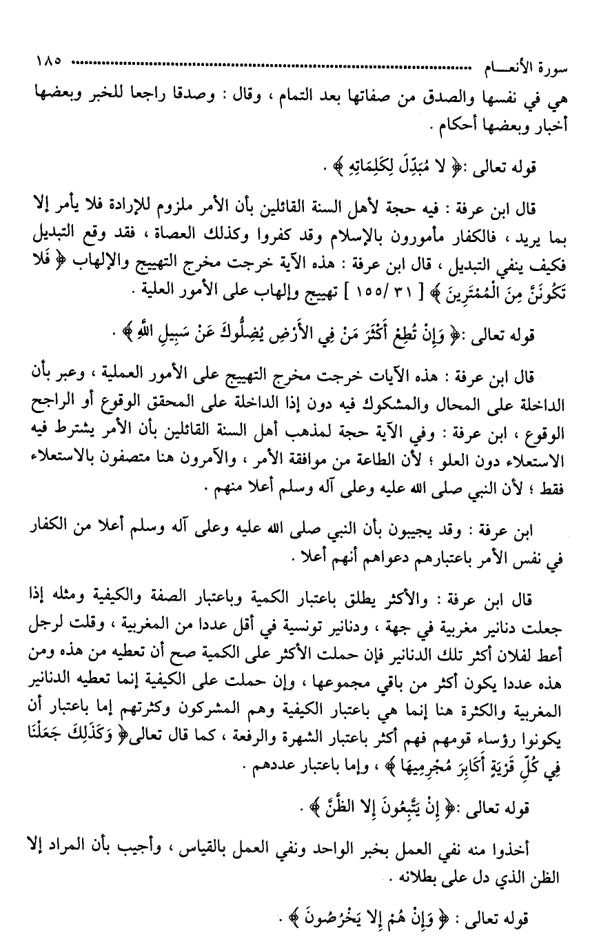 قال ابن عرفة: والأكثر يطلق باعتبار الكمية وباعتبار الصفة والكيفية ومثله إذا جعلت دنانير مغربية في جهة، ودنانير تونسية [هي*] أقل عددا من المغربية، وقلت لرجل أعط لفلان أكثر تلك الدنانير فإن حملت الأكثر على الكمية صح أن تعطيه من هذه ومن هذه عددا يكون أكثر من باقي مجموعها، وإن حملت على الكيفية إنما تعطيه الدنانير المغربية والكثرة هنا إنما هي باعتبار الكيفية وهم المشركون وكثرتهم إما باعتبار أن يكونوا رؤساء قومهم فهم أكثر باعتبار الشهرة والرفعة، كما قال تعالى (وَكَذَلِكَ جَعَلْنَا فِي كُلِّ قَرْيَةٍ أَكَابِرَ مُجْرِمِيهَا)، وإما باعتبار عددهم.