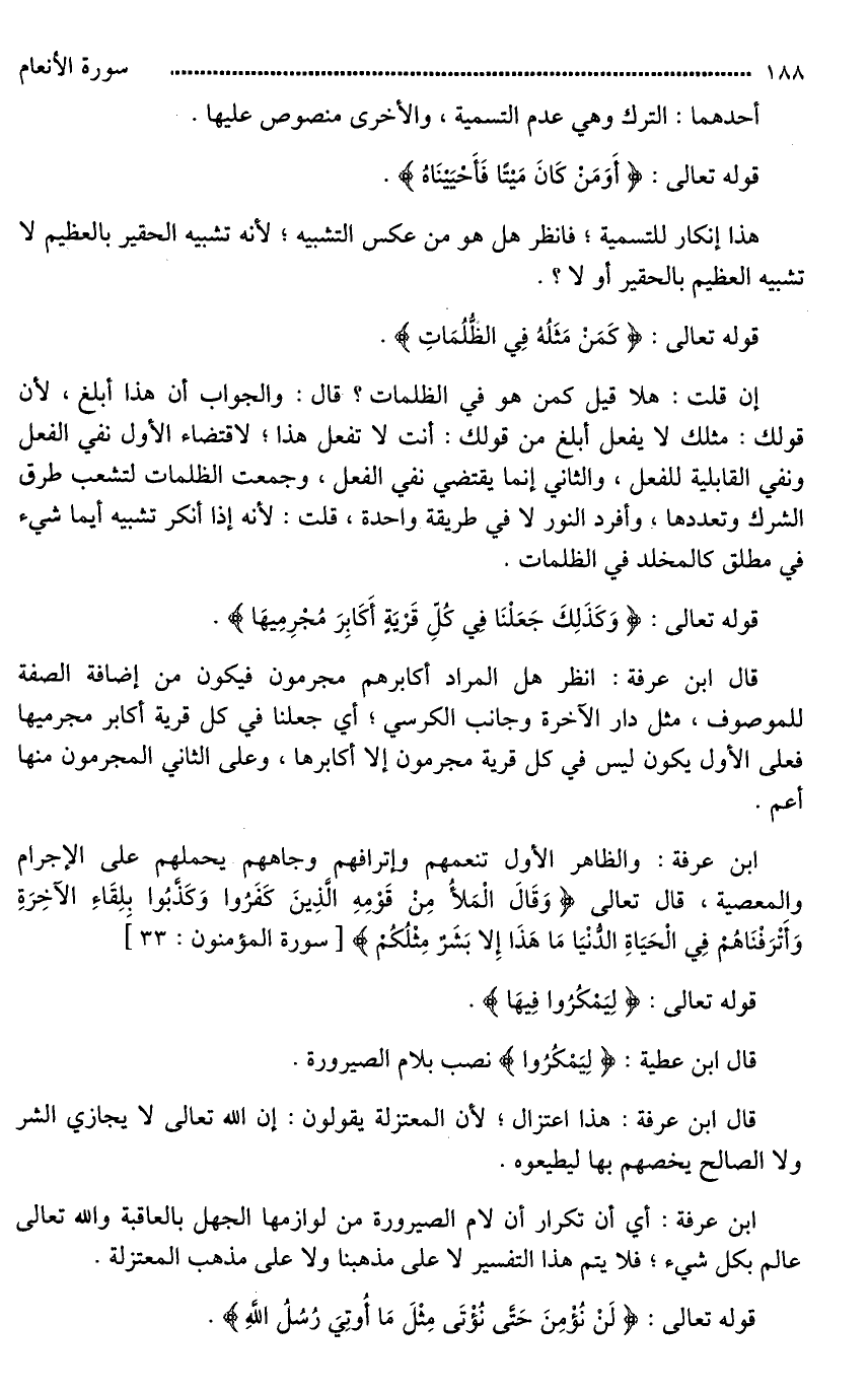 قال ابن عرفة: انظر هل المراد أكابرهم مجرمون فيكون من إضافة الصفة للموصوف، مثل دار الآخرة وجانب الكرسي؛ أي جعلنا في كل قرية أكابر مجرميها فعلى الأول يكون ليس في كل قرية مجرمون إلا أكابرها، وعلى الثاني المجرمون منها أعم.