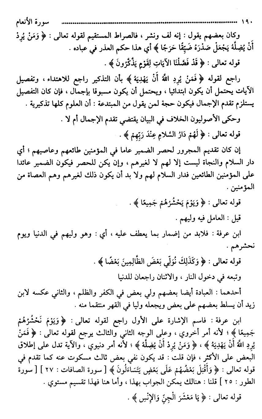 ابن عرفة: فاسم الإشارة على الأول راجع لقوله تعالى: (وَيَوْمَ يَحْشُرُهُمْ جَمِيعًا)؛ لأنه أمر أخروي، وعلى الوجه الثاني والثالث يرجع لقوله تعالى: (فَمَنْ يُرِدِ اللَّهُ أَنْ يَهْدِيَهُ)، (وَمَنْ يُرِدْ أَنْ يُضِلَّهُ)؛ لأنه أمر دنيوي، والآية تدل على إطلاق البعض على الأكثر، فإن قلت: قد يكون نفي بعض ثالث مسكوت عنه كما تقدم في قوله تعالى: (وَأَقْبَلَ بَعْضُهُم عَلَى بَعْضٍ يَتَسَاءَلُونَ) قلنا: هنالك يمكن الجواب بهذا، وأما هنا فهذا تقسيم مستوي.