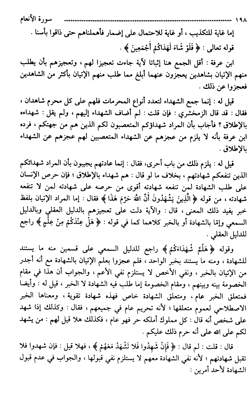 قيل له: يلزم ذلك من باب أحرى، فقال: إنما عادتهم يجيبون بأن المراد شهدائكم الذين تنفعكم شهادتهم، بخلاف ما لو قال: هم شهداء بالإطلاق؛ فإِن حرص الإنسان على طلب الشهادة لمن تنفعه شهادته أقوى من حرصه على شهادته لمن لَا تنفعه شهادته، من قوله (الَّذِينَ يَشْهَدُونَ أَنَّ اللَّهَ حَرَّمَ هَذَا ... (150) .. فقال: إما المراد الإتيان بلفظ خبر يفيد ذلك المعنى، قال: والآية دلت على تعجيزهم بالدليل العقلي وبالدليل السمعي وإمَّا بالشهادة أو بالخبر كلاهما كما في قوله: (هَلْ عِنْدَكُم مِنْ عِلْمٍ) راجع للدليل العقلي.