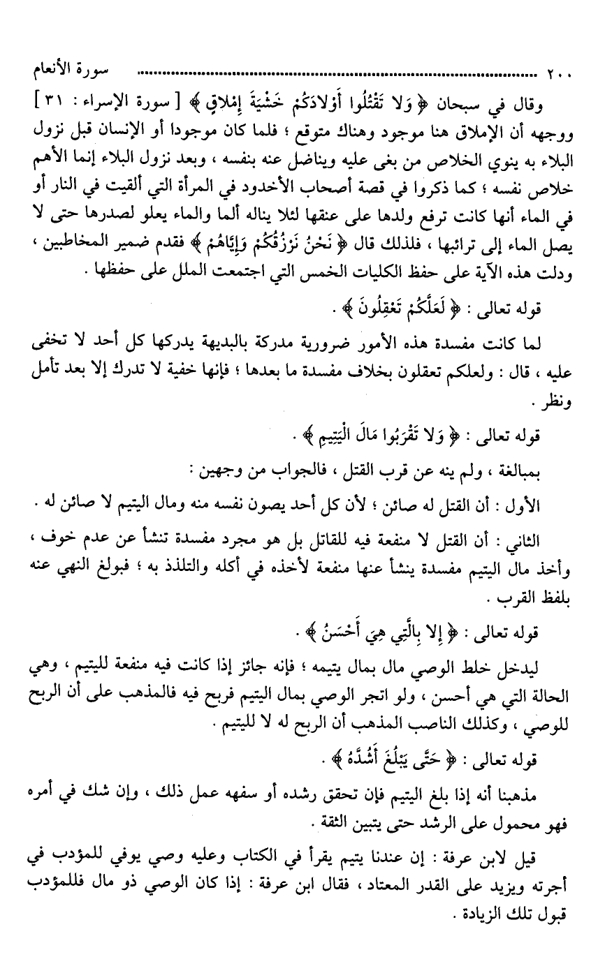 وقال في سبحان (1) (وَلَا تَقْتُلُوا أَوَّلادَكُم خَشيَةَ إِمْلاقٍ) ووجهه أن الإملاق هنا موجود وهناك متوقع؛ فلما كان موجودا أو الإنسان قبل نزول البلاء به ينوي الخلاص من بغى عليه ويناضل عنه بنفسه، وبعد نزول البلاء إنما الأهم خلاص نفسه؛ كما ذكروا في قصة أصحاب الأخدود في المرأة التي ألقيت في النار أو في الماء أنها كانت ترفع ولدها على عنقها لئلا يناله [الماء*] والماء يعلو لصدرها حتى لا يصل الماء إلى ترائبها، فلذلك قال (نَحْنُ نَرْزُقُكُمْ وَإِيَّاهُمْ) فقدم ضمير المخاطبين، ودلت هذه الآية على حفظ الكليات الخمس التي اجتمعت الملل على حفظها.