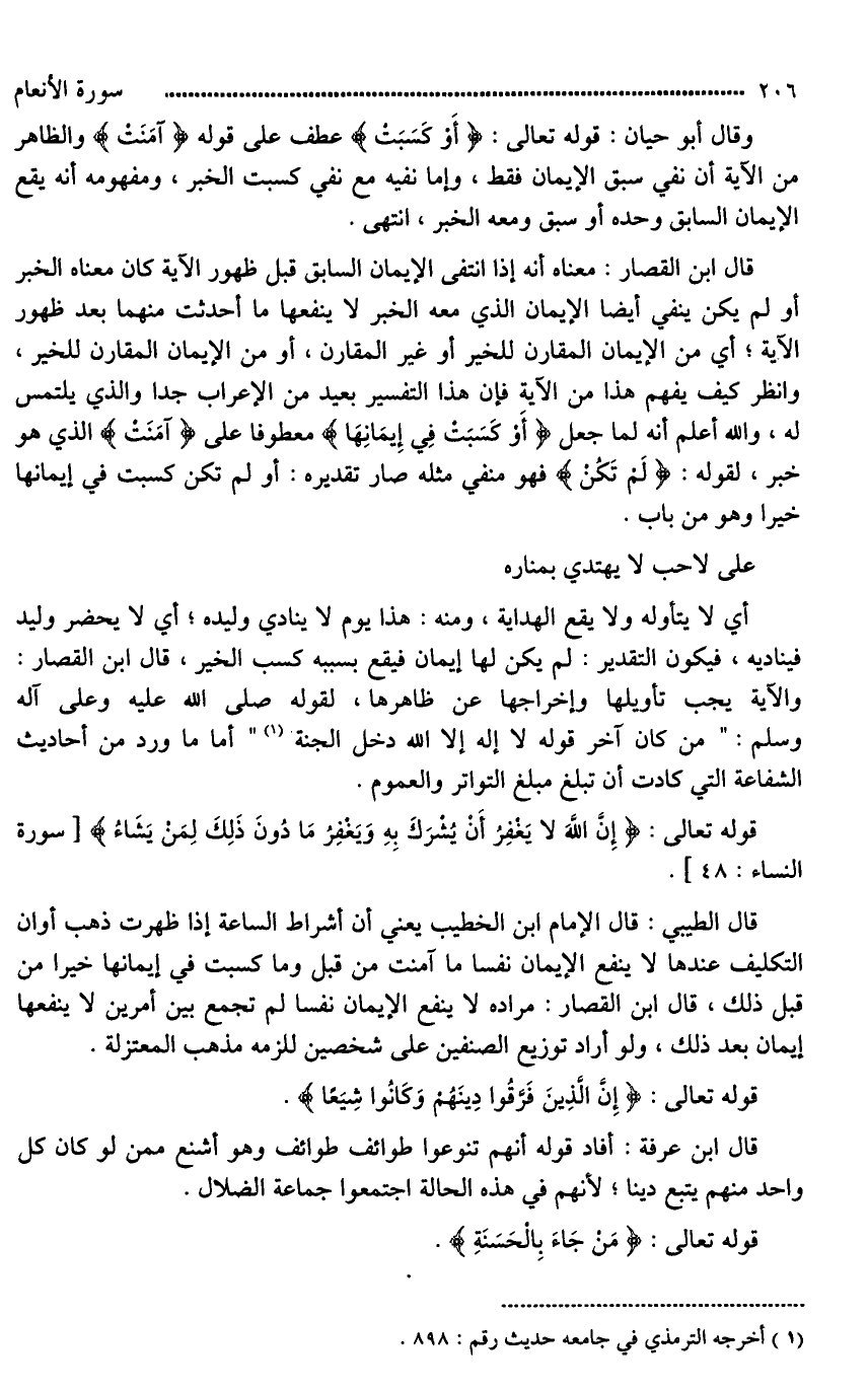 أي لَا يتأوله ولا يقع الهداية، ومنه: هذا يوم لَا ينادي وليده؛ أي لَا يحضر وليد فيناديه، فيكون التقدير: لم يكن لها إيمان فيقع بسببه كسب الخير، قال ابن القصار: والآية يجب تأويلها وإخراجها عن ظاهرها، لقوله صلى الله عليه وعلى آله وسلم: "من كان آخر قوله لَا إله إلا الله دخل الجنة". أما ما ورد من أحاديث الشفاعة التي كادت أن تبلغ مبلغ التواتر والعموم.