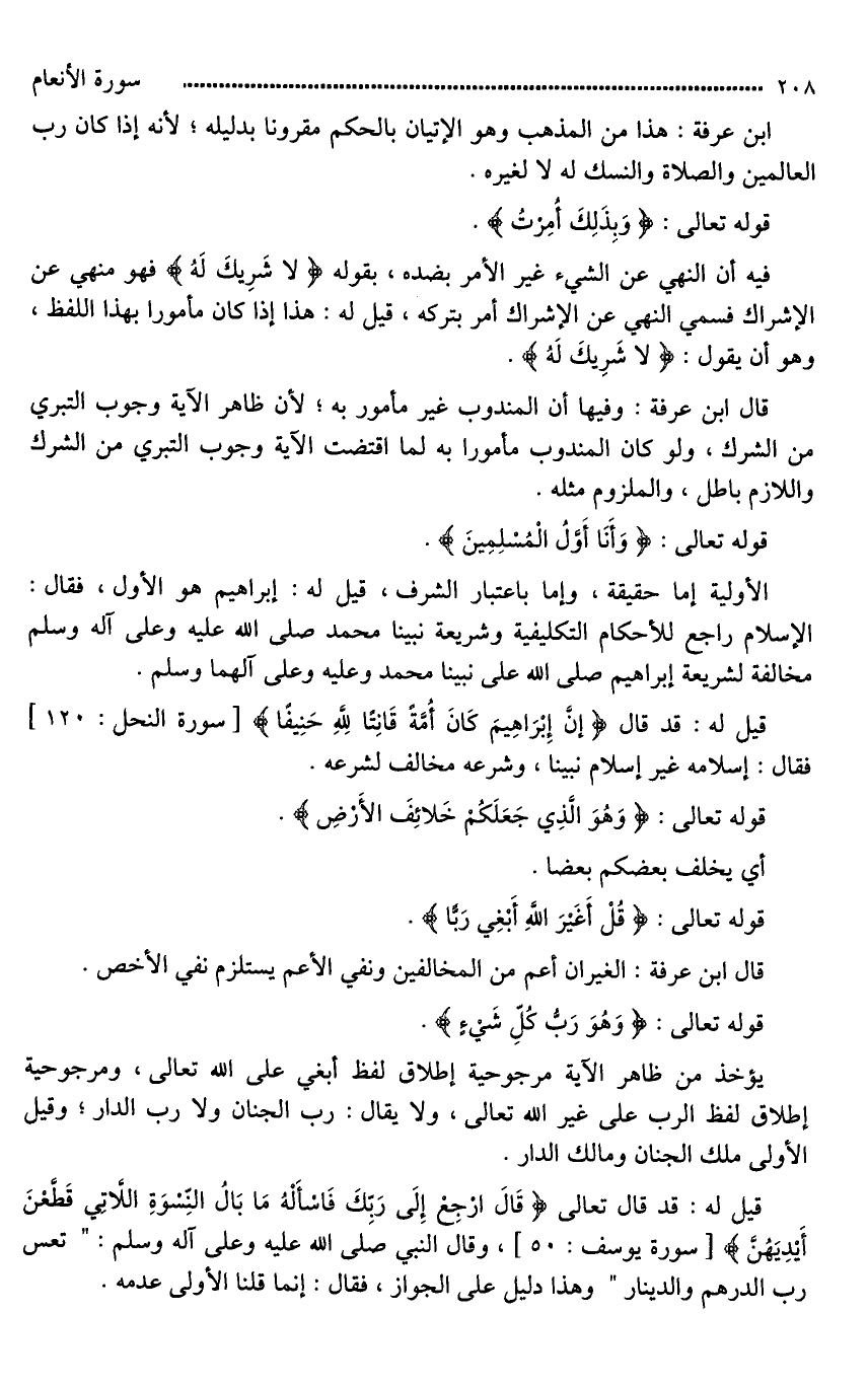 ابن عرفة: هذا من المذهب وهو الإتيان بالحكم مقرونا بدليله؛ لأنه إذا كان رب العالمين والصلاة والنسك له لَا لغيره.