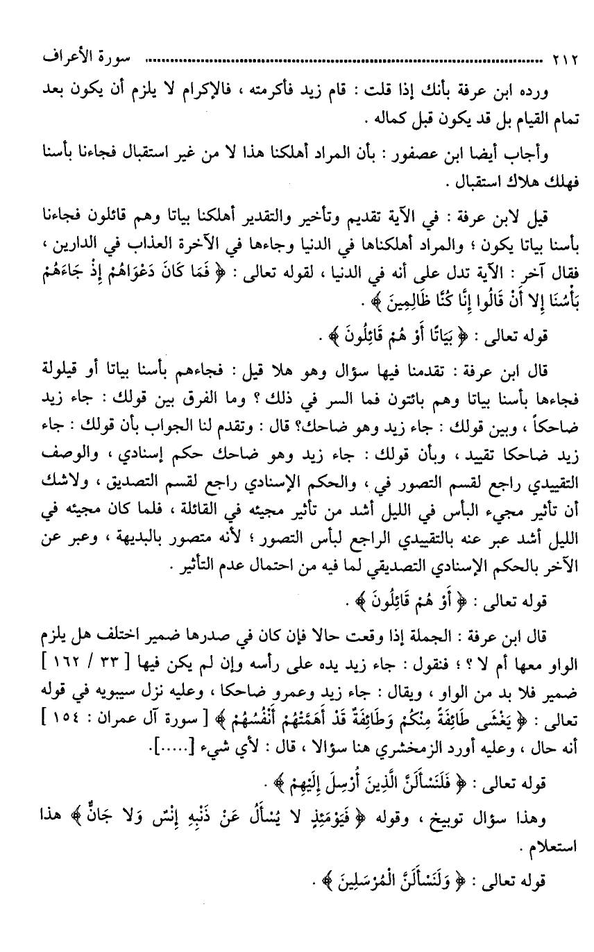 قال ابن عرفة: تقدمنا فيها سؤال وهو هلا قيل: فجاءهم بأسنا بياتا أو قيلولة فجاءها بأسنا بياتا وهم بائتون فما السر في ذلك؟ وما الفرق بين قولك: جاء زيد ضاحكاً، وبين قولك: جاء زيد وهو ضاحك؟ قال: وتقدم لنا الجواب بأن قولك: جاء زيد ضاحكا تقييد، وبأن قولك: جاء زيد وهو ضاحك حكم إسنادي، والوصف التقييدي راجع لقسم [التصور*]، والحكم الإسنادي راجع لقسم التصديق، ولا شك أن تأثير مجيء البأس في الليل أشد من تأثير مجيئه في القائلة، فلما كان مجيئه في الليل أشد عبر عنه بالتقييدي الراجع لبأس التصور؛ لأنه متصور بالبديهة، وعبر عن الآخر بالحكم الإسنادي التصديقي لما فيه من احتمال عدم التأثير.