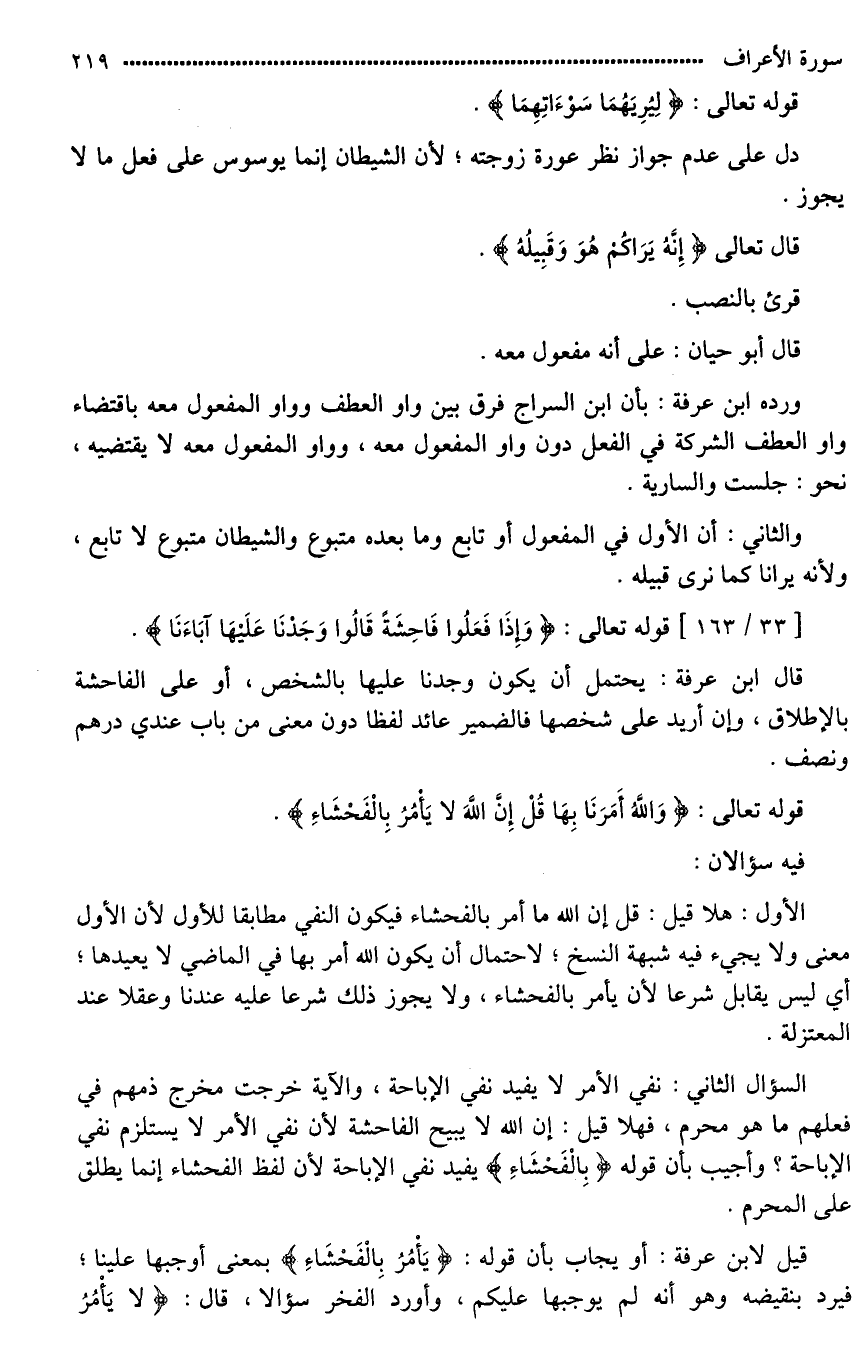 قيل لابن عرفة: أو يجاب بأن قوله: (يَأْمُرُ بِالْفَحْشَاءِ) بمعنى أوجبها علينا؛ فيرد بنقيضه وهو أنه لم يوجبها عليكم، وأورد الفخر سؤالا، قال: (لَا يَأْمُرُ