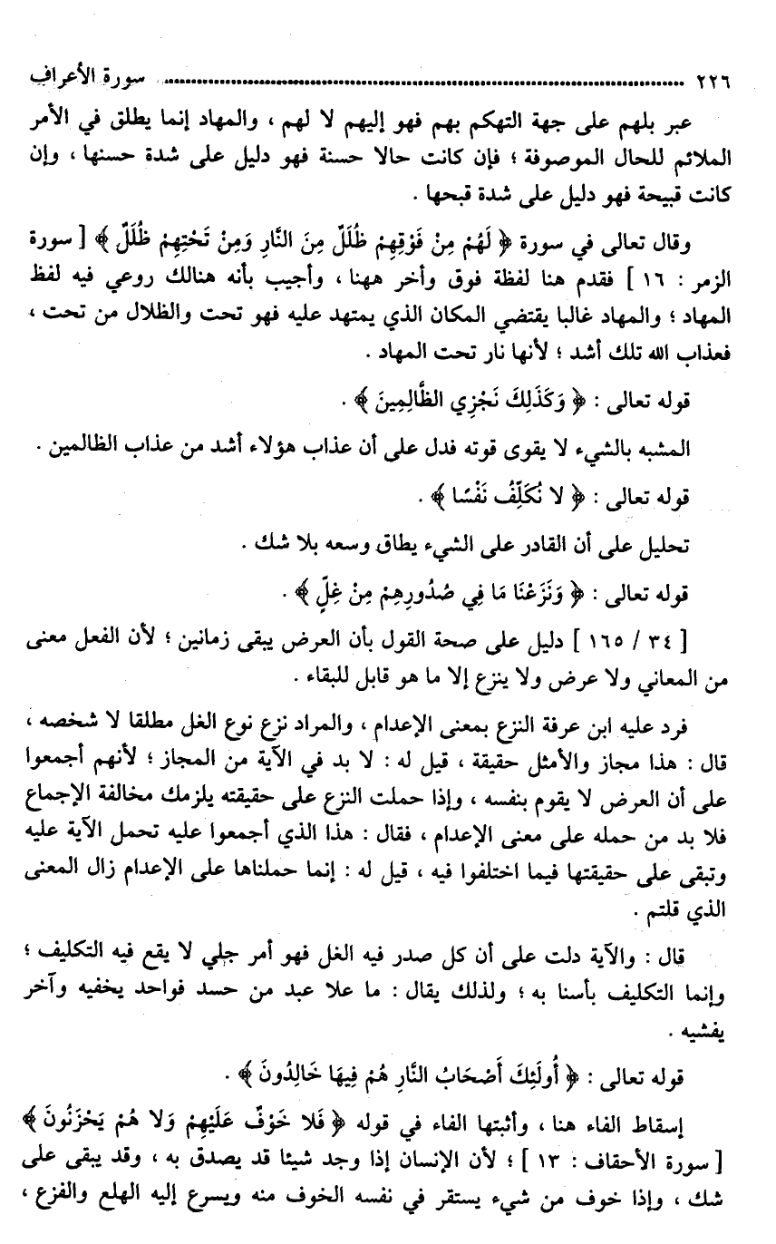 فرد عليه ابن عرفة النزع بمعنى الإعدام، والمراد نزع نوع الغل مطلقا لَا شخصه، قال: هذا مجاز والأمثل حقيقة، قيل له: لَا بد في الآية من المجاز. لأنهم أجمعوا على أن العرض لَا يقوم بنفسه، وإذا حملت النزع على حقيقته يلزمك مخالفة الإجماع فلا بد من حمله على معنى الإعدام، فقال: هذا الذي أجمعوا عليه تحمل الآية عليه وتبقى على حقيقتها فيما اختلفوا فيه، قيل له: إنما حملناها على الإعدام زال المعنى الذي قلتم.