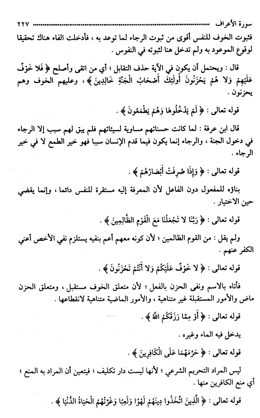 قال: [ويحتمل أن يكون في الآية حذف التقابل؛ أي من اتقى وأصلح (فَلَا خَوْفٌ عَلَيْهِمْ وَلَا هُمْ يَحْزَنُونَ (13) [أُولَئِكَ أَصْحَابُ الْجَنَّةِ هُمْ فِيهَا خَالِدُونَ)، وَلاَ خَوْفَ عَلَيهِمْ وَلاَ هُمْ يَحْزَنُونَ (أي لا حزن عليهم) وَالَّذينَ كَفَرُوا وَكَذَّبُوا بِآيَاتِنَا أُوْلئِكَ أَصْحَابُ النَّارِ هُمْ فِيهَا خَالِدُونَ، وعليهم الخوف وهم يحزنون*] (¬1)