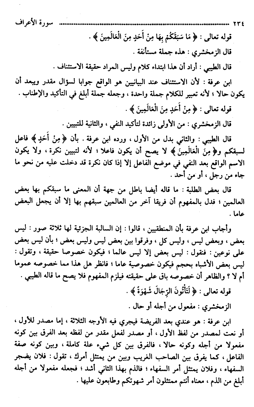 قال الطيبي: والثاني بدل من الأول، ورده ابن عرفة. بأن (مِنْ أَحَدٍ) فاعل لـ سبقكم و (مِنَ الْعَالَمِينَ) لَا يصح أن يكون فاعلا؛ لأنه لتبيين نكرة، ولا يكون الاسم الواقع بعد النفي في موضع الفاعل إلا إذا كان نكرة قد دخلت عليه من نحو ما جاء من رجل، أو من أحد.