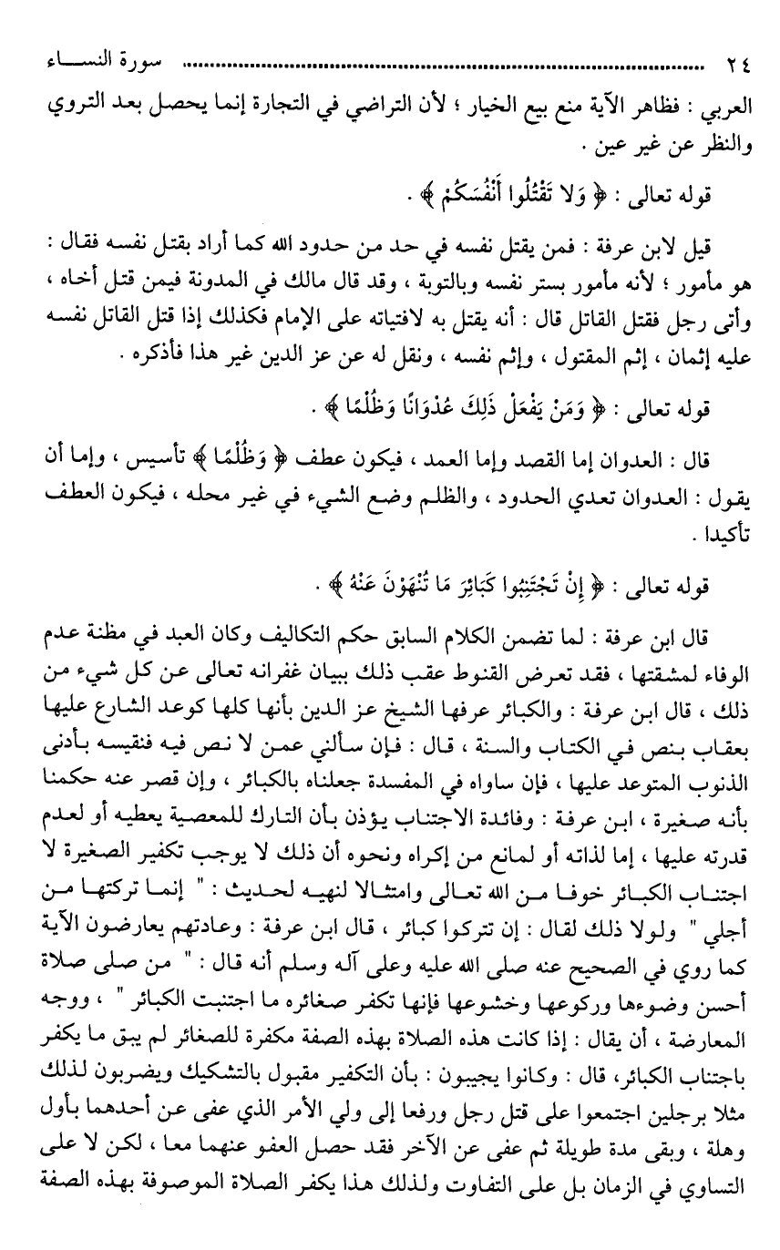 قال ابن عرفة: لما تضمن الكلام السابق حكم التكاليف وكان العبد في مظنة عدم الوفاء لمشقتها، فقد تعرض القنوط عقب ذلك ببيان غفرانه تعالى عن كل شيء من ذلك، قال ابن عرفة: والكبائر عرفها الشيخ عز الدين بأنها كلها كوعد الشارع عليها بعقاب بنص في الكتاب والسنة، قال: فإن سألني عمن لَا نص فيه فنقيسه بأدنى الذنوب المتوعد عليها، فإن ساواه في المفسدة جعلناه بالكبائر، وإن قصر عنه حكمنا بأنه صغيرة، ابن عرفة: وفائدة الاجتناب يؤذن بأن التارك للمعصية يعطيه أو لعدم قدرته عليها، إما لذاته أو لمانع من إكراه ونحوه أن ذلك لَا يوجب تكفير الصغيرة لا اجتناب الكبائر خوفا من الله تعالى وامتثالا لنهيه لحديث: "إنما تركتها من أجلي" ولولا ذلك لقال: إن تتركوا كبائر، قال ابن عرفة: وعادتهم يعارضون الآية كما روي في الصحيح عنه صلى الله عليه وعلى آله وسلم أنه قال: "من صلى صلاة أحسن وضوءها وركوعها وخشوعها فإنها تكفر صغائره ما اجتنبت الكبائر"، ووجه المعارضة، أن يقال: إذا كانت هذه الصلاة بهذه الصفة مكفرة للصغائر لم يبق ما يكفر باجتناب الكبائر، قال: وكانوا يجيبون: بأن التكفير مقبول بالتشكيك ويضربون لذلك مثلا برجلين اجتمعوا على قتل رجل ورفعا إلى ولي الأمر الذي عفى عن أحدهما بأول وهلة، وبقي مدة طويلة ثم عفى عن الآخر فقد حصل العفو عنهما معا، لكن لَا على التساوي في الزمان بل على التفاوت ولذلك هذا يكفر الصلاة الموصوفة بهذه الصفة