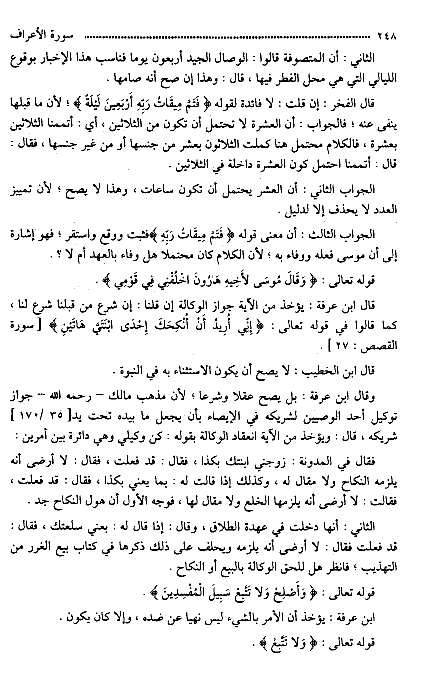 قال الفخر: إن قلت: لَا فائدة لقوله (فَتَمَّ مِيقَاتُ رَبِّهِ أَرْبَعِينَ لَيْلَةً)؛ لأن ما قبلها ينفى عنه؛ فالجواب: أن العشرة لَا تحتمل أن تكون من الثلاثين، أي: أتممنا الثلاثين بعشرة، فالكلام محتمل هنا كملت الثلاثون بعشر من جنسها أو من غير جنسها، فقال: قال: أتممنا احتمل كون العشرة داخلة في الثلاثين.