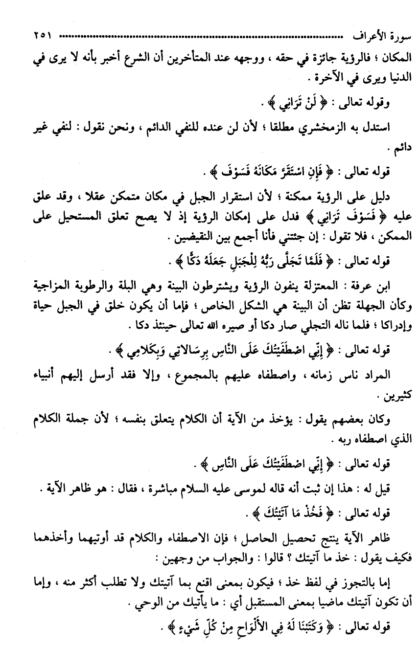 ابن عرفة: المعتزلة ينفون الرؤية ويشترطون البينة وهي البلة والرطوبة المزاجية وكان الجهلة تظن أن البينة هي الشكل الخاص؛ فإِما أن يكون خلق في الجبل حياة وإدراكا؛ فلما ناله التجلي صار دكا أو صيره الله تعالى حينئذ دكا.