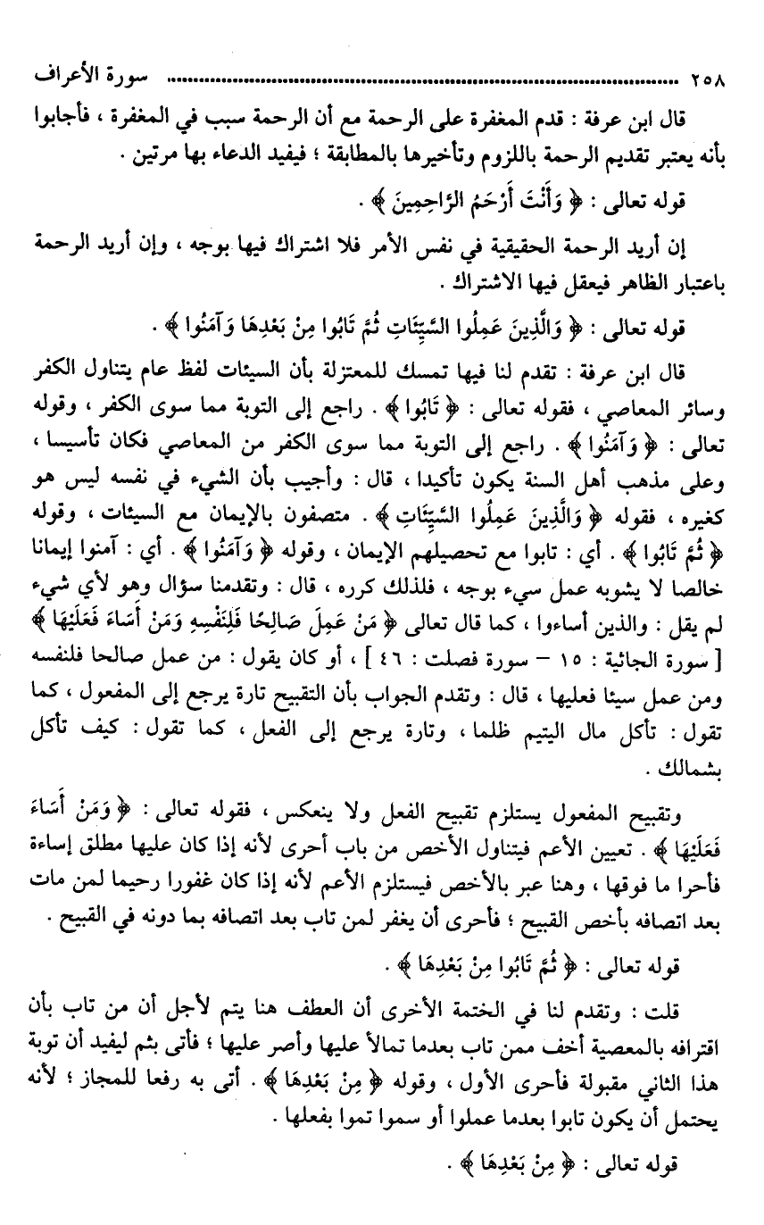 قال ابن عرفة: تقدم لنا فيها تمسك للمعتزلة بأن السيئات لفظ عام يتناول الكفر وسائر المعاصي، فقوله تعالى: (تَابُوا). راجع إلى التوبة مما سوى الكفر، وقوله تعالى: (وَآمَنُوا). راجع إلى التوبة مما سوى الكفر من المعاصي فكان تأسيسا، وعلى مذهب أهل السنة يكون تأكيدا، قال: وأجيب بأن الشيء في نفسه ليس هو كغيره، فقوله (وَالَّذِينَ عَمِلُوا السَّيِّئَاتِ). متصفون بالإيمان مع السيئات، وقوله (ثُمَّ تَابُوا). أي: تابوا مع تحصيلهم الإيمان، وقوله (وَآمَنُوا). أي: آمنوا إيمانا خالصا لَا يشوبه عمل سيئ بوجه، فلذلك كرره، قال: وتقدمنا سؤال وهو لأي شيء لم يقل: والذين أساءوا، كما قال تعالى (مَنْ عَمِلَ صَالِحًا فَلِنَفْسِهِ وَمَنْ أَسَاءَ فَعَلَيْهَا) أو كان يقول: من عمل صالحا فلنفسه ومن عمل سيئا فعليها، قال: وتقدم الجواب بأن التقبيح تارة يرجع إلى المفعول، كما تقول: تأكل مال اليتيم ظلما، وتارة يرجع إلى الفعل، كما تقول: كيف تأكل بشمالك.