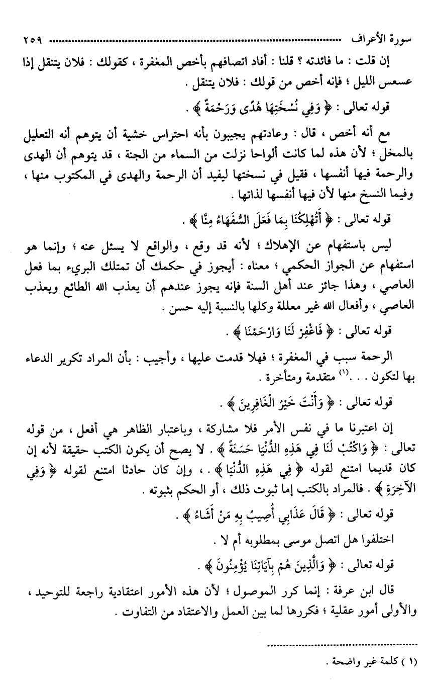 مع أنه أخص، قال: وعادتهم يجيبون بأنه [احتراس خشية أن يتوهم أنه تعليل بالمخل*]؛ لأن هذه لما كانت ألواحا نزلت من السماء من الجنة، قد يتوهم أن الهدى والرحمة فيها أنفسها، فقيل (وَفِي نُسْخَتِهَا) ليفيد أن الرحمة والهدى في المكتوب منها، [وفي النسخ منها، لا فيها أنفسها لذاتها*].