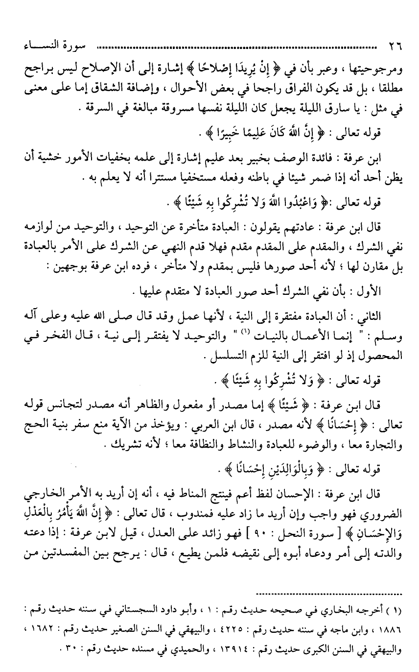 قال ابن عرفة: (شَيْئًا) إما مصدر أو مفعول والظاهر أنه مصدر لتجانس قوله تعالى: (إِحْسَانًا) لأنه مصدر، قال ابن العربي: ويؤخذ من الآية منع سفر بنية الحج والتجارة معا، والوضوء للعبادة والنشاط والنظافة معا؛ لأنه تشريك.