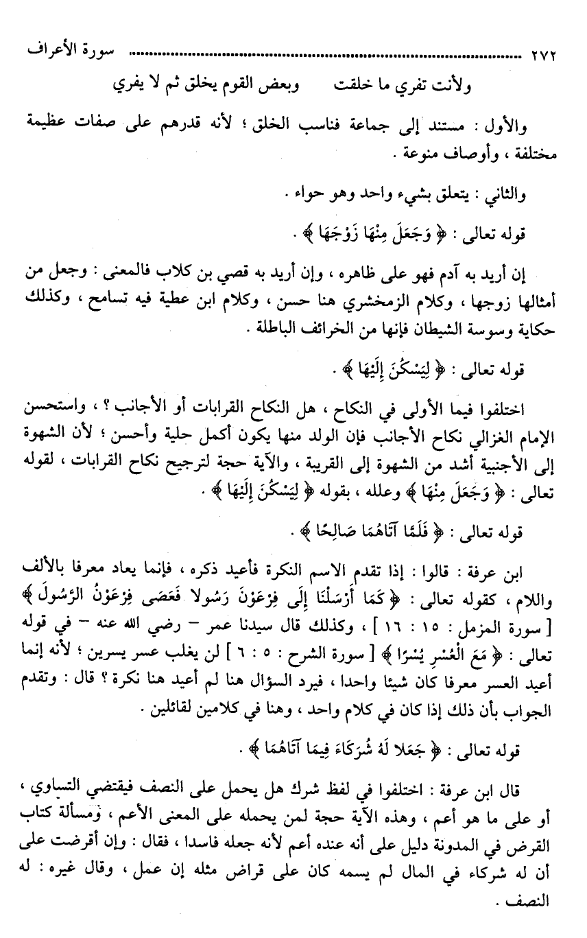 إن أريد به آدم فهو على ظاهره، وإن أريد به قصي بن كلاب فالمعنى: وجعل من أمثالها زوجها، وكلام الزمخشري هنا حسن، وكلام ابن عطية فيه تسامح، وكذلك حكاية وسوسة الشيطان فإنها من الخرائف الباطلة.