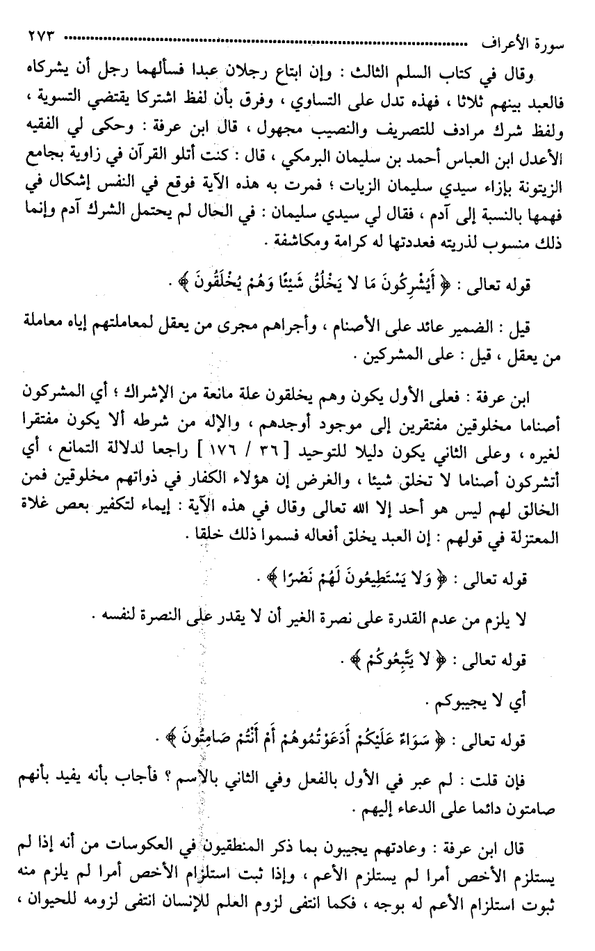 ابن عرفة: فعلى الأول يكون وهم يخلقون علة مانعة من الإشراك؛ أي المشركون أصناما مخلوقين مفتقرين إلى موجود أوجدهم، والإله من شرطه ألا يكون مفتقرا لغيره، وعلى الثاني يكون دليلا للتوحيد راجعا لدلالة التمانع، أي أتشركون أصناما لَا تخلق شيئا، والغرض إن هؤلاء الكفار في ذواتهم مخلوقين فمن الخالق لهم ليس هو أحد إلا الله تعالى وقال في هذه الآية: إيماء لتكفير بعض غلاة المعتزلة في قولهم: إن العبد يخلق أفعاله فسموا ذلك خلقا.