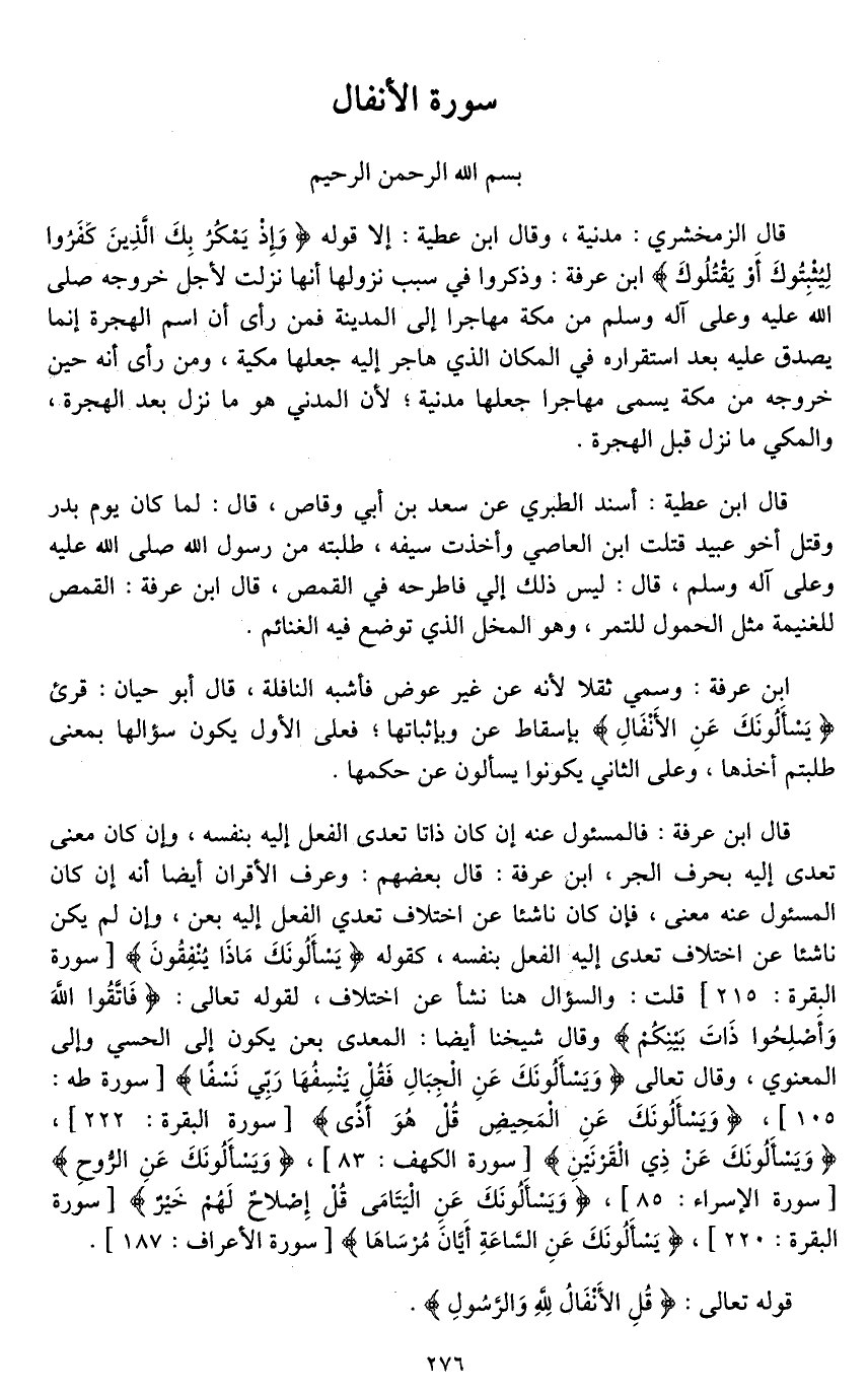 ابن عرفة: وسمي ثقلا لأنه عن غير عوض فأشبه النافلة، قال أبو حيان: قرئ (يَسْأَلُونَكَ عَنِ الأَنْفَالِ (1) .. بإسقاط عن وبإثباتها؛ فعلى الأول يكون سؤالها بمعنى طلبتم أخذها، وعلى الثاني [يكون*] يسألون عن حكمها.
