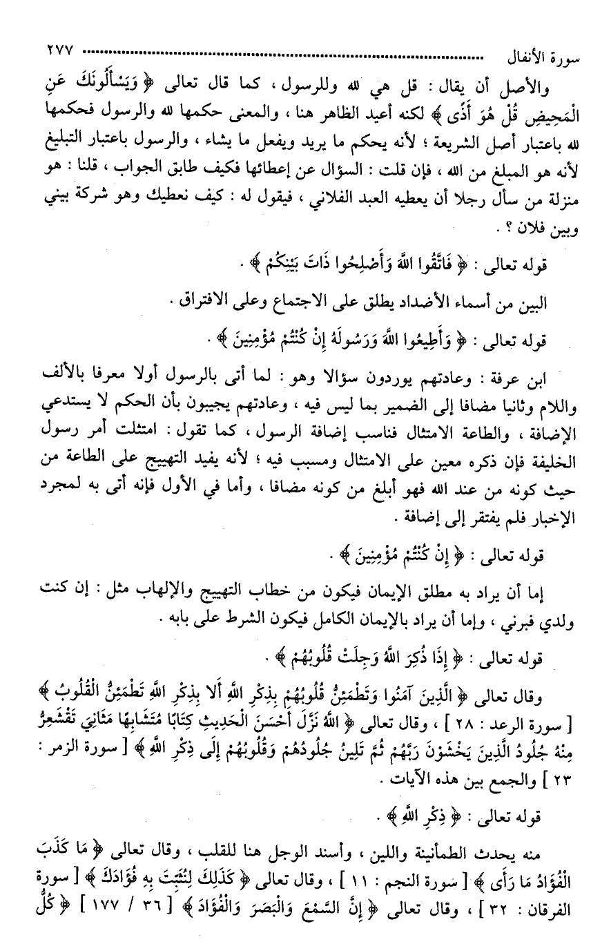 وقال تعالى (الَّذِينَ آمَنُوا وَتَطْمَئِنُّ قُلُوبُهُمْ بِذِكْرِ اللَّهِ أَلَا بِذِكْرِ اللَّهِ تَطْمَئِنُّ الْقُلُوبُ)، وقال تعالى (اللَّهُ نَزَّلَ أَحْسَنَ الْحَدِيثِ كِتَابًا مُتَشَابِهًا مَثَانِيَ تَقْشَعِرُّ مِنْهُ جُلُودُ الَّذِينَ يَخْشَوْنَ رَبَّهُمْ ثُمَّ تَلِينُ جُلُودُهُمْ وَقُلُوبُهُمْ إِلَى ذِكْرِ اللَّهِ) والجمع بين هذه الآيات.