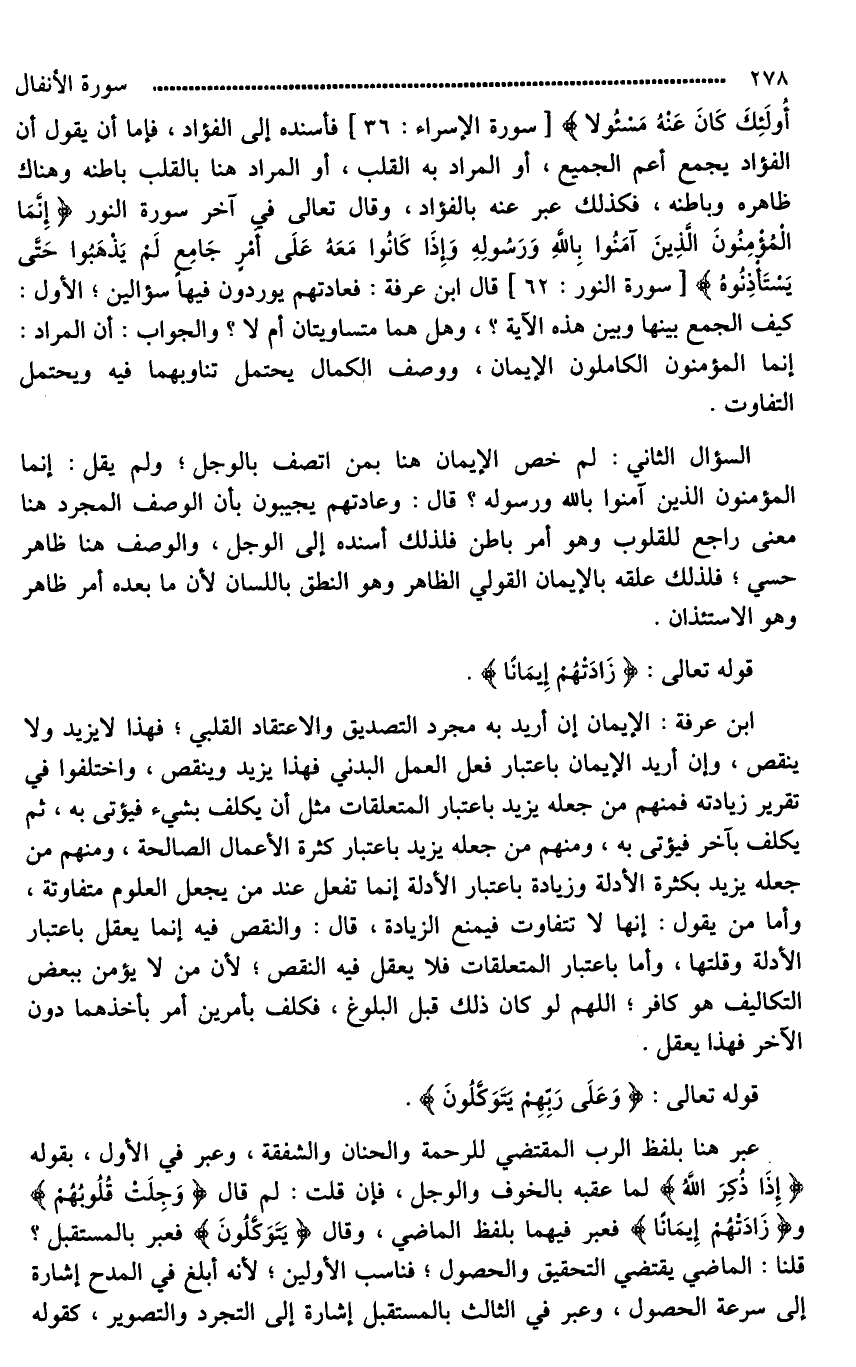أُولَئِكَ كَانَ عَنْهُ مَسْئُولًا) فأسنده إلى الفؤاد، فإما أن يقول أن الفؤاد يجمع أعم الجميع، أو المراد به القلب، أو المراد هنا بالقلب باطنه وهناك ظاهره وباطنه، فكذلك عبر عنه بالفؤاد، وقال تعالى فى آخر سورة النور (إِنَّمَا الْمُؤْمِنُونَ الَّذِينَ آمَنُوا بِاللَّهِ وَرَسُولِهِ وَإِذَا كَانُوا مَعَهُ عَلَى أَمْرٍ جَامِعٍ لَمْ يَذْهَبُوا حَتَّى يَسْتَأْذِنُوهُ) قال ابن عرفة: فعادتهم يوردون فيها سؤالين؛ الأول: كيف الجمع بينها وبين هذه الآية؟، وهل هما متساويتان أم لَا في والجواب: أن المراد: إنما المؤمنون الكاملون الإيمان، ووصف الكمال يحتمل تناوبهما فيه ويحتمل التفاوت.