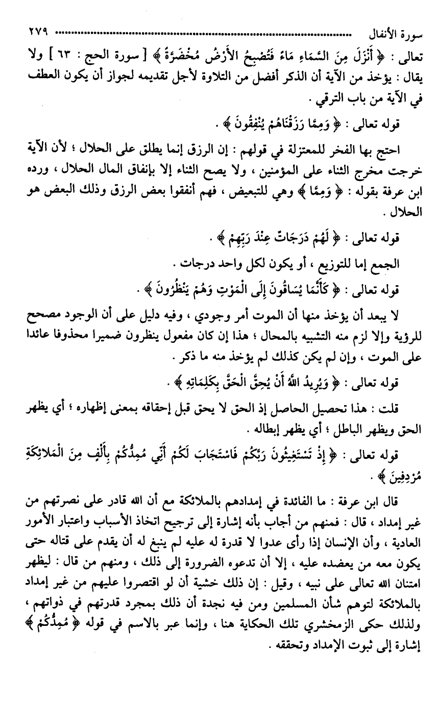 قال ابن عرفة: ما الفائدة في إمدادهم بالملائكة مع أن الله قادر على نصرتهم من غير إمداد، قال: فمنهم من أجاب بأنه إشارة إلى ترجيح اتخاذ الأسباب واعتبار الأمور العادية، وأن الإنسان إذا رأى عدوا لَا قدرة له عليه لم ينبغ له أن يقدم على قتاله حتى يكون معه من يعضده عليه، إلا أن تدعوه الضرورة إلى ذلك، ومنهم من قال: ليظهر امتنان الله تعالى على نبيه، وقيل: إن ذلك خشية أن لو اقتصروا عليهم من غير إمداد بالملائكة لتوهم شأن المسلمين ومن فيه نجدة أن ذلك بمجرد قدرتهم في ذواتهم، ولذلك حكى الزمخشري تلك الحكاية هنا، وإنما عبر بالاسم في قوله (مُمِدُّكُم) إشارة إلى ثبوت الإمداد وتحققه.