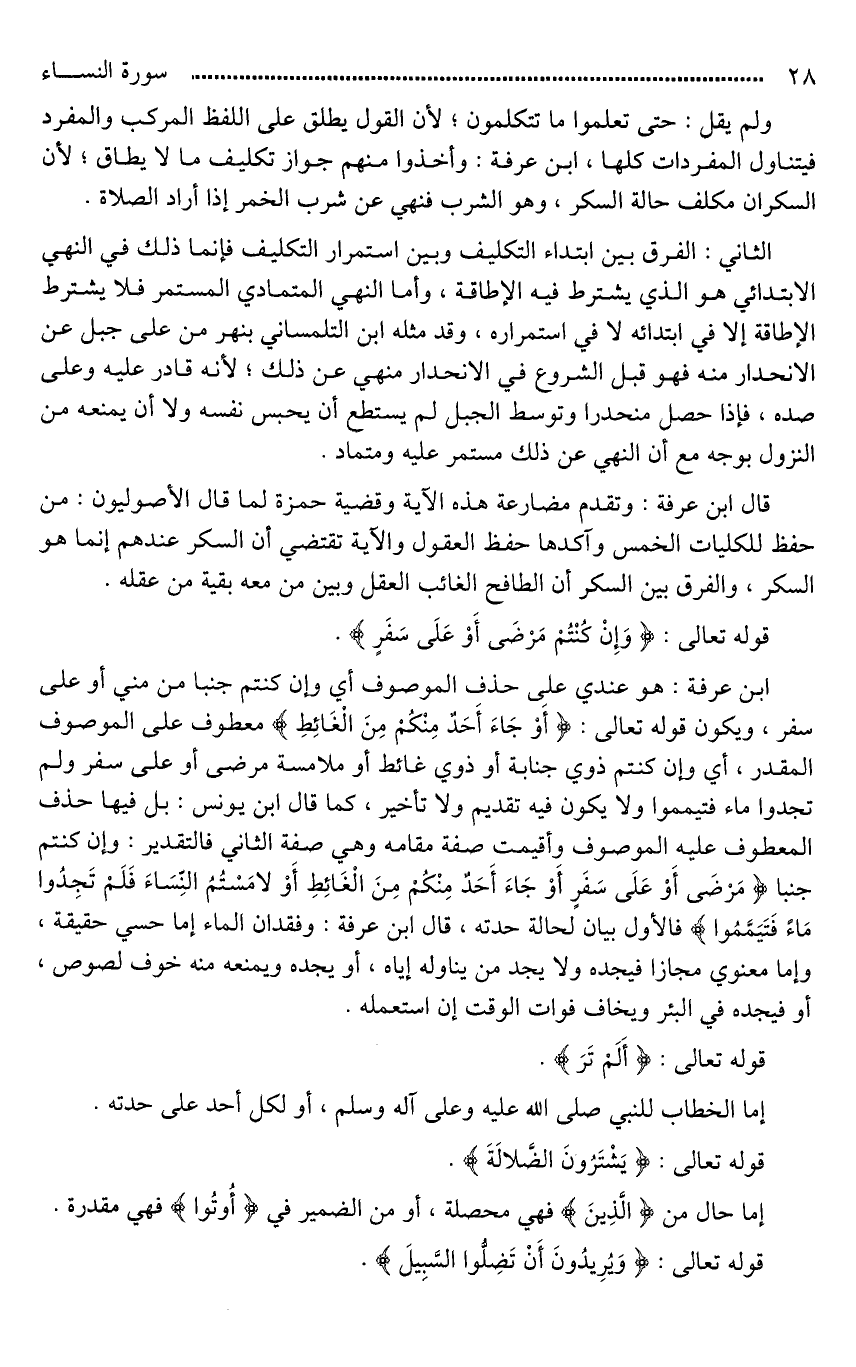 ولم يقل: حتى تعلموا ما تتكلمون؛ لأن القول يطلق على اللفظ المركب والمفرد فيتناول المفردات كلها، ابن عرفة: وأخذوا منهم جواز تكليف ما لَا يطاق؛ لأن السكران مكلف حالة السكر، وهو الشرب فنهي عن شرب الخمر إذا أراد الصلاة.