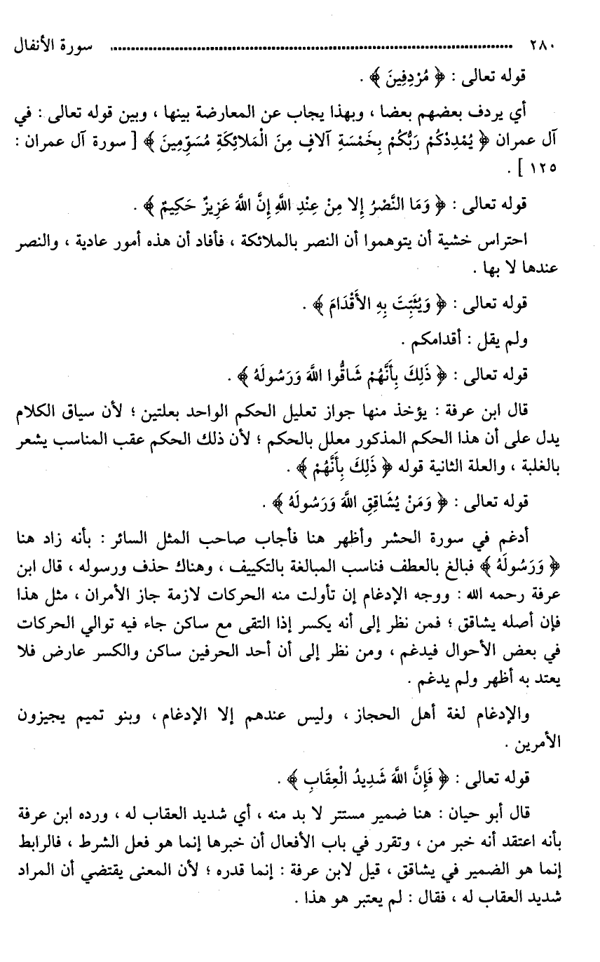 أدغم في سورة الحشر وأظهر هنا فأجاب صاحب المثل السائر: بأنه زاد هنا (وَرَسُولَهُ) فبالغ بالعطف فناسب المبالغة [بالتضعيف*]، وهناك حذف ورسوله، قال ابن عرفة رحمه الله: ووجه الإدغام إن تأولت منه الحركات لازمة جاز الأمران، مثل هذا فإن أصله يشاقق؛ فمن نظر إلى أنه يكسر إذا التقى مع ساكن جاء فيه توالي الحركات في بعض الأحوال فيدغم، ومن نظر إلى أن أحد الحرفين ساكن والكسر عارض، فلا يعتد به أظهر ولم يدغم.