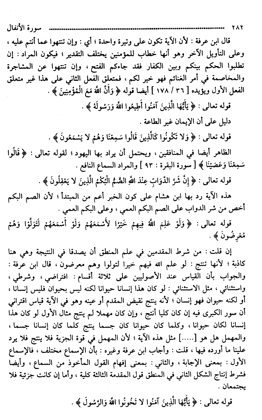 إن قلت: من شرط المقدمين في علم المنطق أن يصدقا في النتيجة وهي هنا كاذبة؛ لأنها تنتج: لو علم الله فيهم خيرا لتولوا وهم معرضون، قال ابن عرفة: والجواب بأن القياس عند الأصوليين على ثلاثة أقسام: افتراضي، وشرطي، واستثنائي، مثل الاستثنائي: لو كان هذا إنسانا حيوانا لكنه ليس بحيوان فليس إنسانا، أو لكنه حيوان فهو إنسان؛ لأنه ينتج نقيض المقدم أو عينه وهو في الآية قياس اقتراني أن سور الكبرى فيه إن كان كليا أنتج، وإن كان مهملا لم ينتج مثال الأول لو كان هذا إنسانا لكان حيوانا، وكلما كان حيوانا كان جسما ينتج كلما كان إنسانا جسما، والمهمل هل هو مثل هذه الآية؛ لأن المهمل في قوة الجزية فلا ينتج فلا يرد علينا ما أورده فيها، قلت: وأجاب ابن عرفة وغيره: بأن الإسماع مختلف، فالإسماع الأول: بمعنى الإجابة، والثاني: بمعنى إفهام القول المأخوذ من السماع، وأيضا فشرط إنتاج الشكل الثاني في المنطق قول المقدمة الثالثة كلية، وأما إن كانت جزئية فلا يجتمعان.