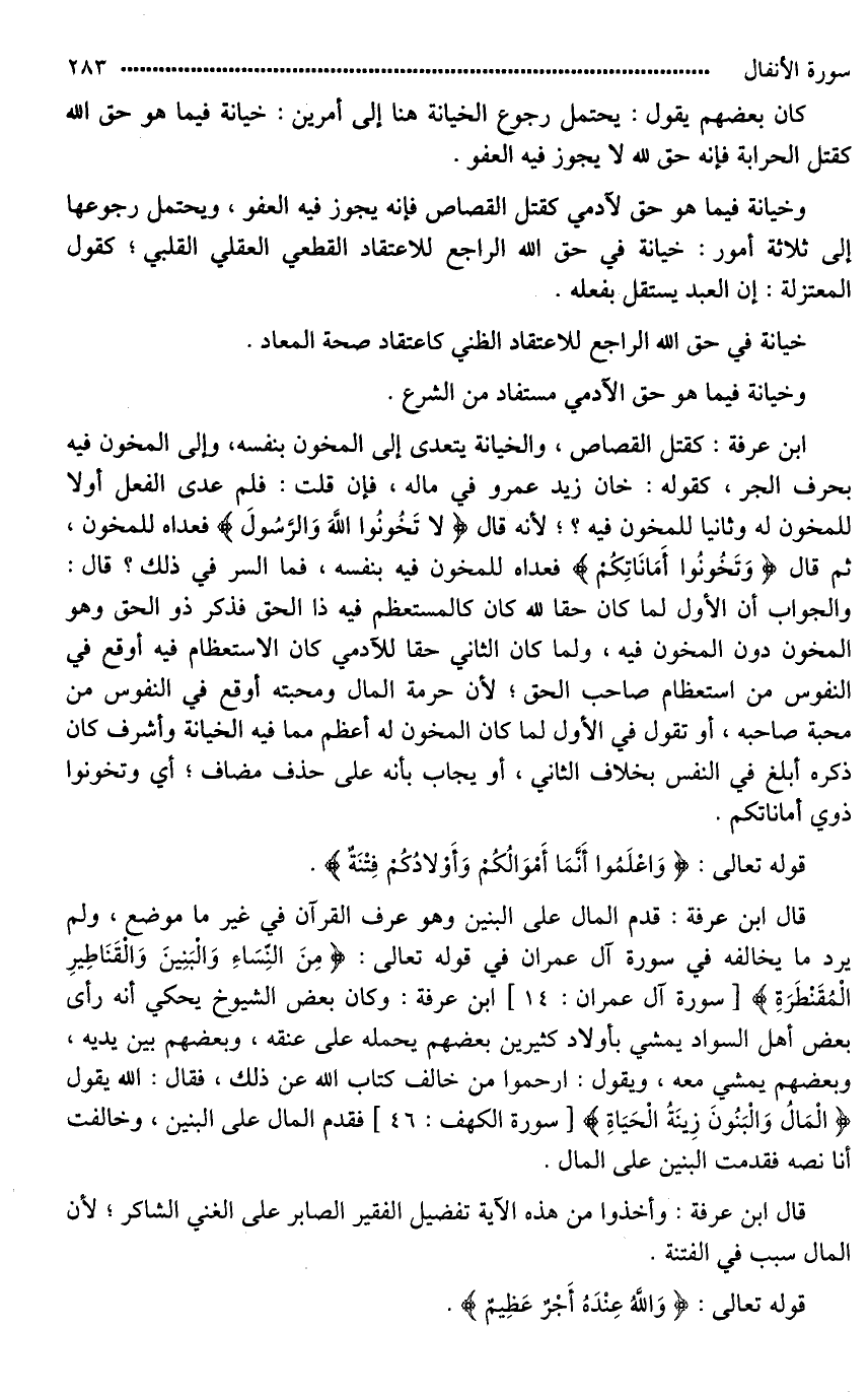 قال ابن عرفة: قدم المال على البنين وهو عرف القرآن في غير ما موضع، ولم يرد ما يخالفه في سورة آل عمران في قوله تعالى: (مِنَ النِّسَاءِ وَالْبَنِينَ وَالْقَنَاطِيرِ الْمُقَنْطَرَةِ) ابن عرفة: وكان بعض الشيوخ يحكي أنه رأى بعض أهل السواد يمشي بأولاد كثيرين بعضهم يحمله على عنقه، وبعضهم بين يديه، وبعضهم يمشي معه، ويقول: ارحموا من خالف كتاب الله عن ذلك، فقال: الله يقول (الْمَالُ وَالْبَنُونَ زِينَةُ الْحَيَاةِ) فقدم المال على البنين، وخالفت أنا نصه فقدمت البنين على المال.