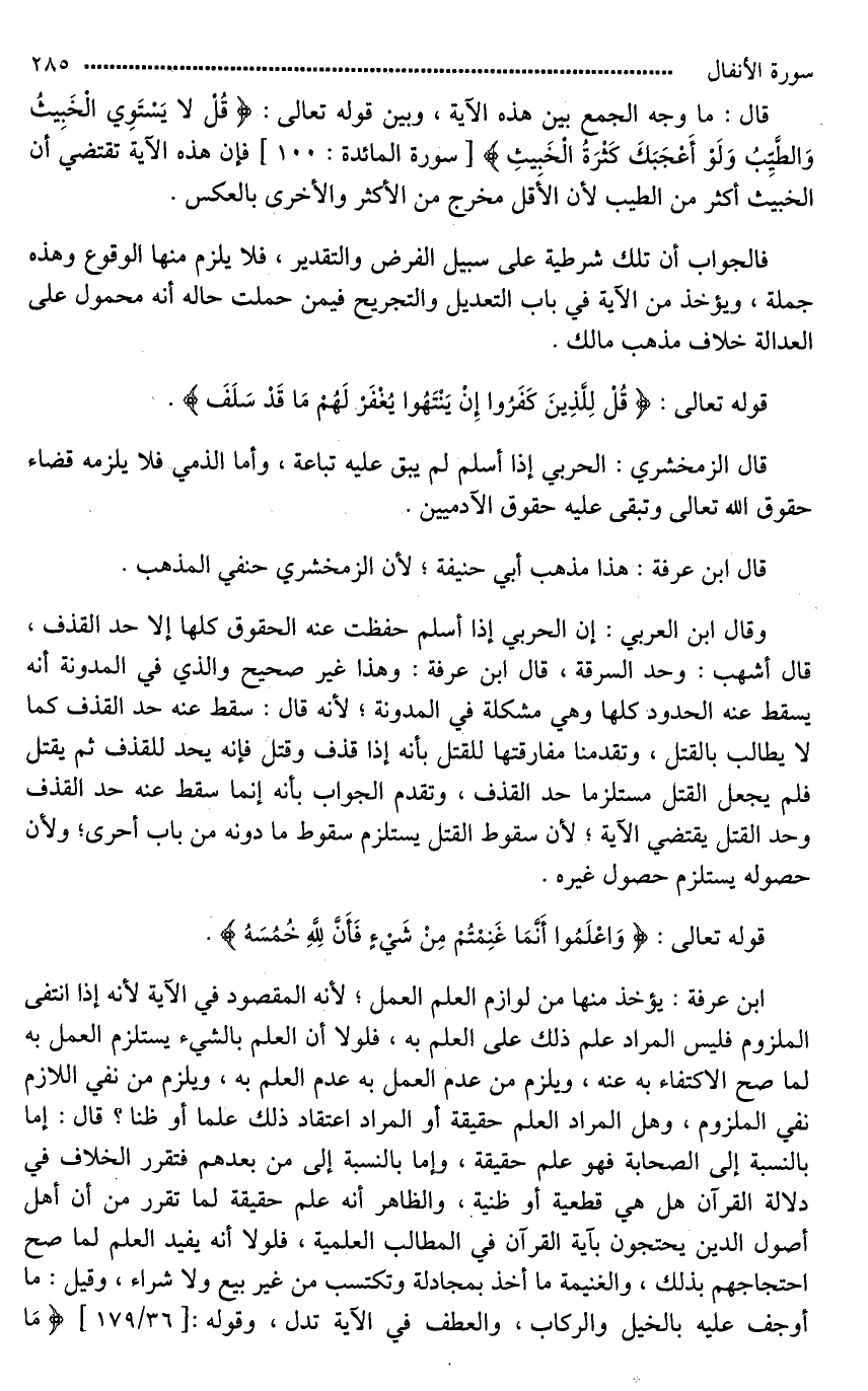 ابن عرفة: يؤخذ منها من لوازم العلم العمل؛ لأنه المقصود في الآية لأنه إذا انتفى الملزوم فليس المراد علم ذلك على العلم به، فلولا أن العلم بالشيء يستلزم العمل به لما صح الاكتفاء به عنه، ويلزم من عدم العمل به عدم العلم به، ويلزم من نفي اللازم نفي الملزوم، وهل المراد العلم حقيقة أو المراد اعتقاد ذلك علما أو ظنا؟ قال: إما بالنسبة إلى الصحابة فهو علم حقيقة، وإما بالنسبة إلى من بعدهم فتقرر الخلاف في دلالة القرآن هل هي قطعية أو ظنية، والظاهر أنه علم حقيقة لما تقرر من أن أهل أصول الدين يحتجون بآية القرآن في المطالب العلمية، فلولا أنه يفيد العلم لما صح احتجاجهم بذلك، والغنيمة ما أخذ بمجادلة وتكتسب من غير بيع ولا شراء، وقيل: ما أوجف عليه بالخيل والركاب، والعطف في الآية تدل، وقوله: (مَا