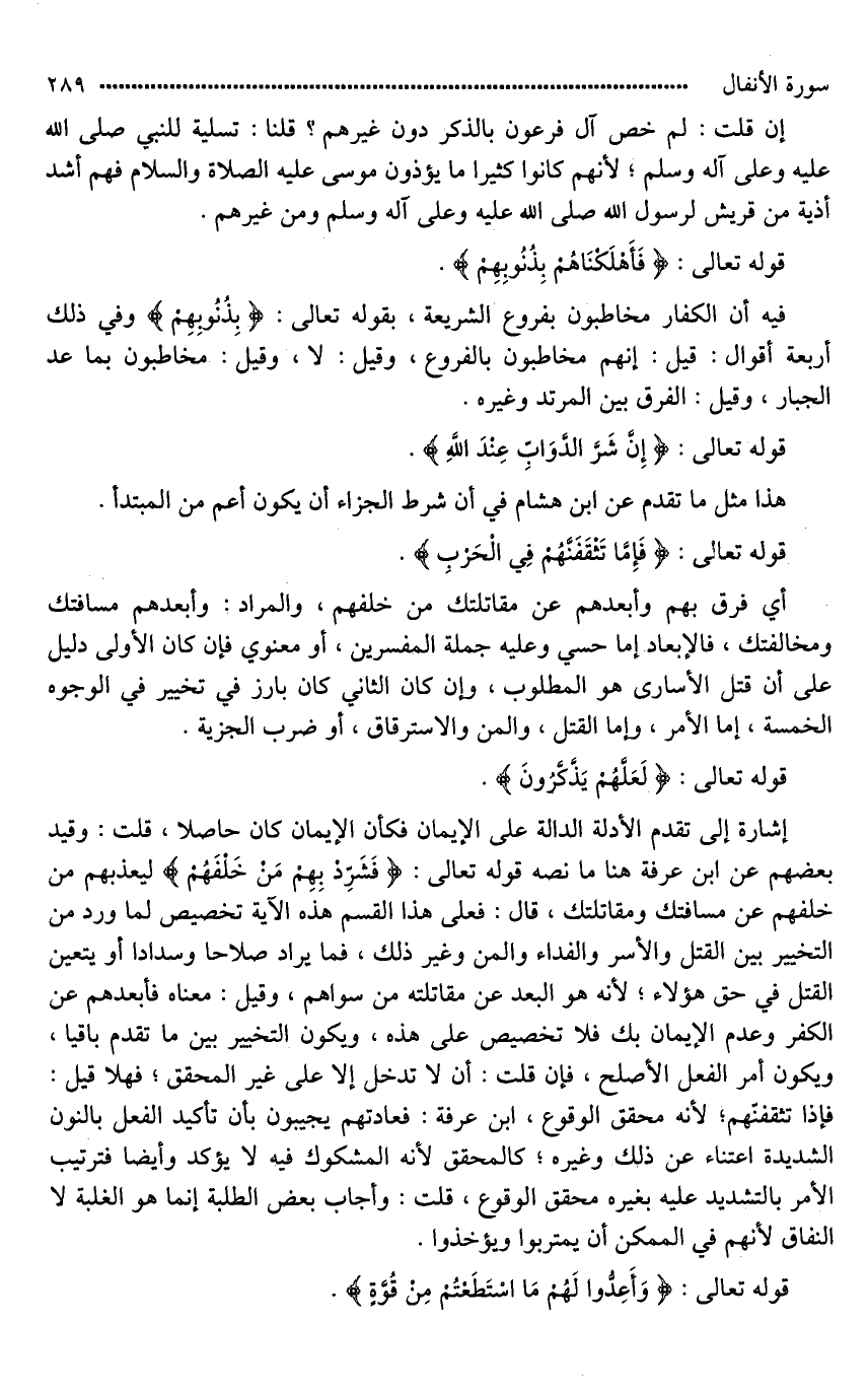 إشارة إلى تقدم الأدلة الدالة على الإيمان فكأن الإيمان كان حاصلا، قلت: وقيد بعضهم عن ابن عرفة هنا ما نصه قوله تعالى: (فَشَرِّدْ بِهِمْ مَنْ خَلْفَهُمْ) ليعذبهم من خلفهم عن مسافتك ومقاتلتك، قال: فعلى هذا القسم هذه الآية تخصيص لما ورد من التخيير بين القتل والأسر والفداء والمن وغير ذلك، فما يراد صلاحا وسدادا أو يتعين القتل في حق هؤلاء؛ لأنه هو البعد عن مقاتلته من سواهم، وقيل: معناه فأبعدهم عن الكفر وعدم الإيمان بك فلا تخصيص على هذه، ويكون التخيير بين ما تقدم باقيا، ويكون أمر الفعل الأصلح، فإن قلت: أن لَا تدخل إلا على غير المحقق؛ فهلا قيل: فإذا تثقفنّهم؛ لأنه محقق الوقوع، ابن عرفة: فعادتهم يجيبون بأن تأكيد الفعل بالنون الشديدة اعتناء عن ذلك وغيره؛ كالمحقق لأنه المشكوك فيه لَا يؤكد وأيضا فترتيب الأمر بالتشديد عليه بغيره محقق الوقوع، قلت: وأجاب بعض الطلبة إنما هو الغلبة لا النفاق لأنهم في الممكن أن يمتربوا ويؤخذوا.