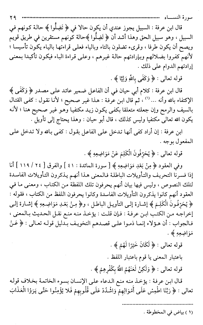 قال ابن عرفة: السبيل يجوز عندي أن يكون حالا في (تَضِلُّوا) حالة كونهم في السبيل، وهو سبيل الحق وهذا أشد أن (تَضِلُّوا) حالة كونهم مستقرين في طريق قويم ويصح أن يكون طرفا، وقرئ (تضلون) بالتاء وبالياء، فعلى قراءتها بالياء يكون تأسيسا؛ لأنهم كفروا بضلالهم [وبإرادتهم إضلال غيرهم*]، وعلى قراءة [الياء*] فيكون تأكيدا بمعنى إرادتهم الدوام على ذلك.