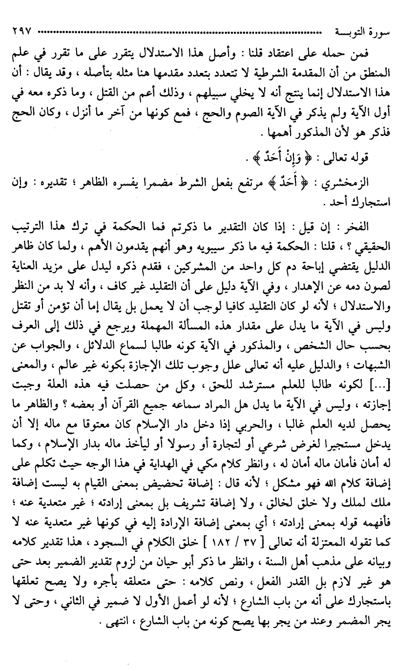 الفخر: (¬1) فَإِنْ قِيلَ: لَمَّا كَانَ التَّقْدِيرُ مَا ذَكَرْتُمْ فَمَا الْحِكْمَةُ فِي تَرْكِ هَذَا التَّرْتِيبِ الْحَقِيقِيِّ؟، قلنا: الحكمة فيه ما ذكر سيبويه وهو أنهم يقدمون الأهم، ولما كان ظاهر الدليل يقتضي إباحة دم كل واحد من المشركين، فقدم ذكره ليدل على مزيد العناية لصون دمه عن الإهدار، وفي الآية دليل على أن التقليد [غَيْرُ كَافٍ فِي الدِّينِ*]، وأنه لَا بد من النظر والاستدلال؛ لأنه لو كان التقليد كافيا لوجب أن لَا [يُمْهَلَ*]؛ بل يقال إِمَّا أَنْ تُؤْمِنَ، وَإِمَّا أَنْ [نَقْتُلَكَ*]، وليس في الآية ما يدل على مقدار هذه المسألة المهملة، ويرجع في ذلك إلى العرف بحسب حال الشخص، والمذكور في الآية كونه طالبا لسماع الدلائل، والجواب عن الشبهات؛ والدليل عليه أنه تعالى علل وجوب تلك [الإجارة*] بكونه غير عالم، والمعنى [فَمَتَى ظَهَرَ عَلَى الْمُشْرِكِ عَلَامَاتُ كَوْنِهِ طَالِبًا*] للعلم مسترشدا للحق، وكل من حصلت فيه هذه العلة وجبت [إجارته*]، وليس في الآية ما يدل، هل المراد سماعه جميع القرآن أو بعضه؟ والظاهر ما يحصل لديه العلم غالبا، والحربي إذا دخل دار الإسلام كان [معصوما*] مع ماله إلا أن يدخل مستجيرا لغرض شرعي أو لتجارة أو رسولا أو ليأخذ ماله بدار الإسلام، وكما له أمان فأمان ماله أمان له، وانظر كلام مكي في الهداية في هذا الوجه حيث تكلم على إضافة كلام الله فهو مشكل؛ لأنه قال: إضافة [تخصيص*] بمعنى القيام به ليست إضافة ملك لملك ولا خلق لخالق، ولا إضافة تشريف؛ بل بمعنى إرادته غير متعدية عنه؛ فافهمه. قوله بمعنى إرادته؛ أي بمعنى إضافة الإرادة إليه في كونها غير متعدية عنه لا كما تقوله المعتزلة أنه تعالى خلق الكلام في السجود، هذا تقدير كلامه وبيانه على مذهب أهل السنة، وانظر ما ذكر أبو حيان من لزوم تقدير الضمير بعد حتى هو غير لازم بل القدر الفعل، ونص كلامه: حتى متعلقه بـ (أَجِرْهُ) ولا يصح تعلقها بـ (اسْتَجَارَكَ) على أنه من باب الشارع؛ لأنه لو أعمل الأول لَا ضمير في الثاني، وحتى لا يجر المضمر وعند من يجر بها يصح كونه من باب الشارع، انتهى.