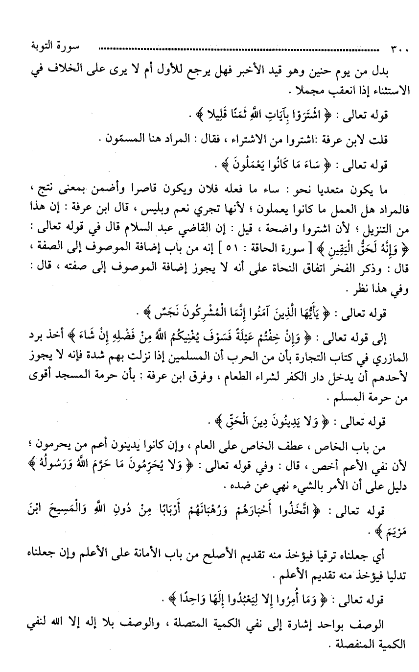 إلى قوله تعالى: (وَإِنْ خِفْتُمْ عَيْلَةً فَسَوْفَ يُغْنِيكُمُ اللَّهُ مِنْ فَضْلِهِ إِنْ شَاءَ) أخذ برد المازري في كتاب التجارة بأن من الحرب أن المسلمين إذا نزلت بهم شدة فإنه لَا يجوز لأحدهم أن يدخل دار الكفر لشراء الطعام، وفرق ابن عرفة: بأن حرمة المسجد أقوى من حرمة المسلم.