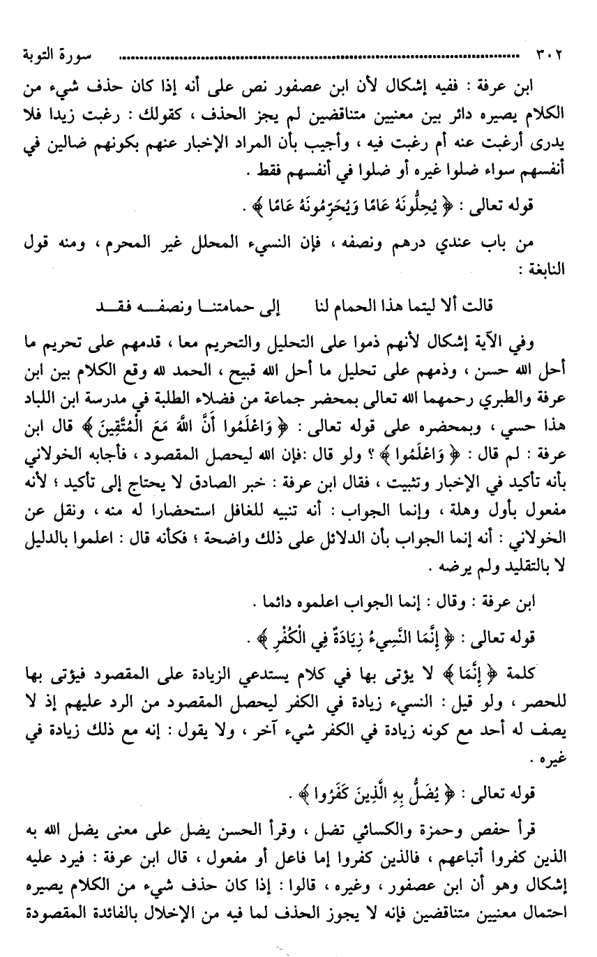 ابن عرفة: فيه إشكال لأن ابن عصفور نص على أنه إذا كان حذف شيء من الكلام يصيره دائر بين معنيين متناقضين لم يجز الحذف، كقولك: رغبت زيدا فلا يدرى أرغبت عنه أم رغبت فيه، وأجيب بأن المراد الإخبار عنهم بكونهم ضالين في أنفسهم سواء ضلوا غيره أو ضلوا في أنفسهم فقط.